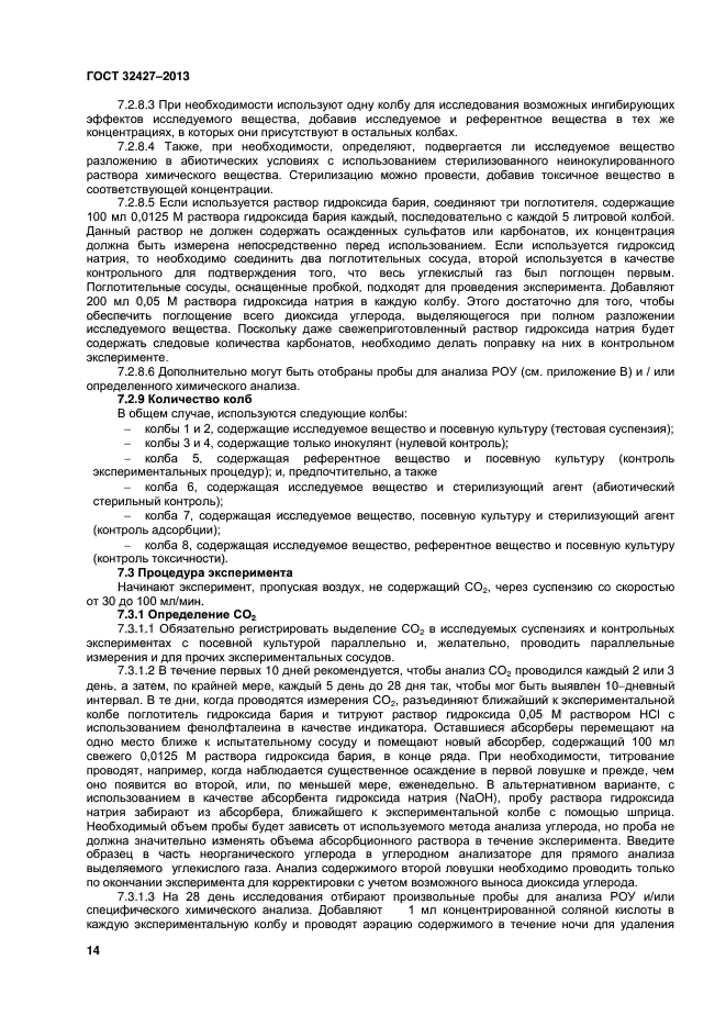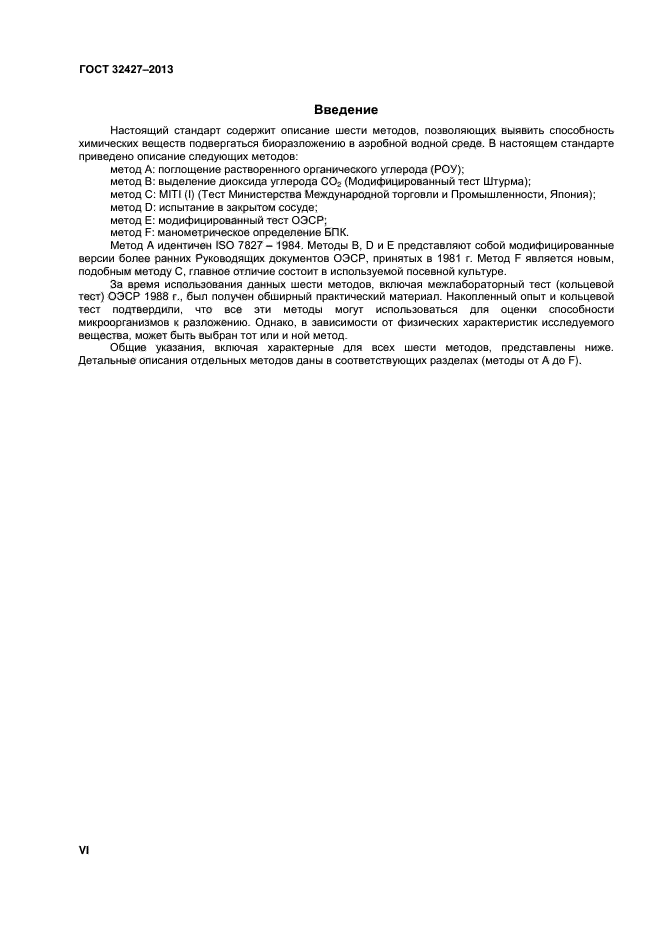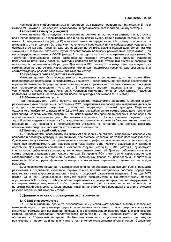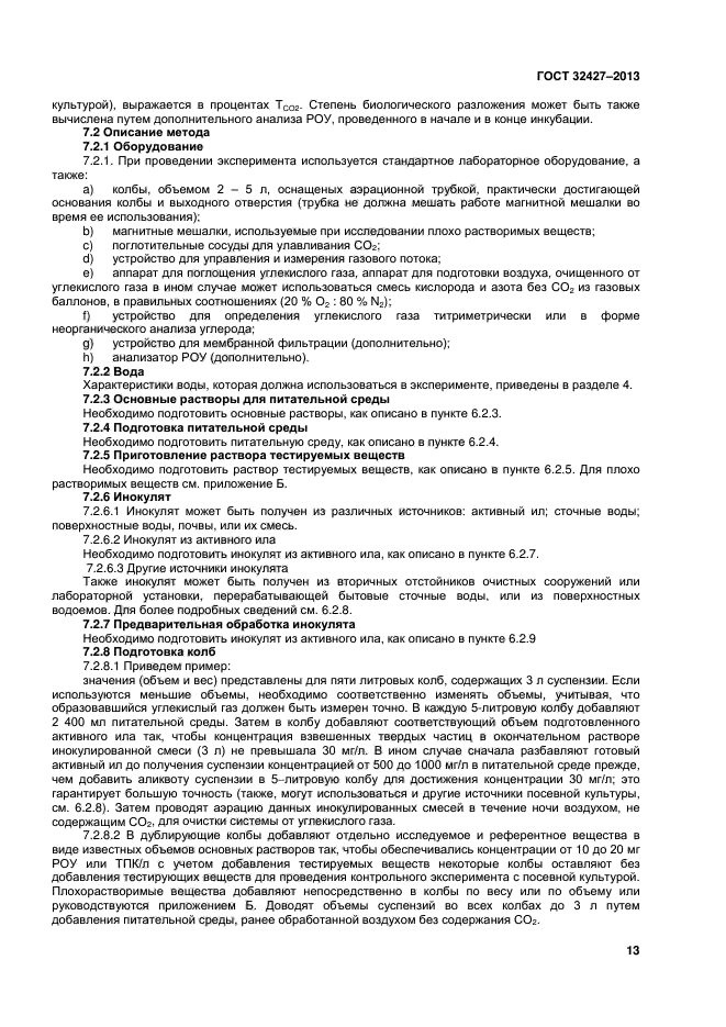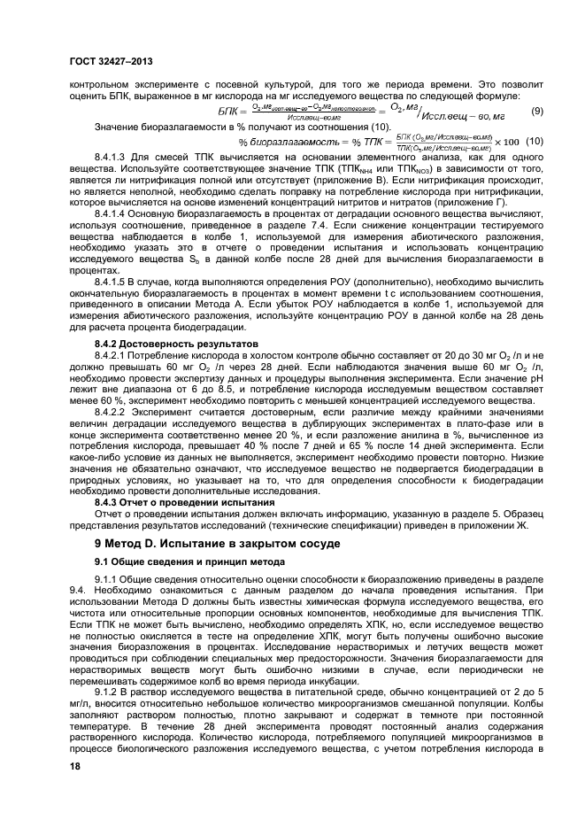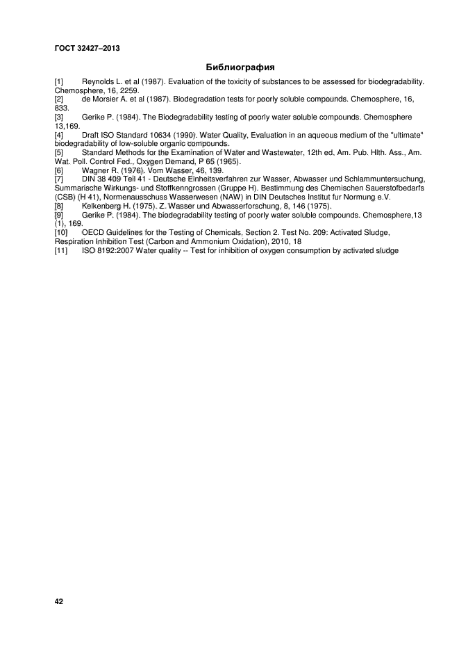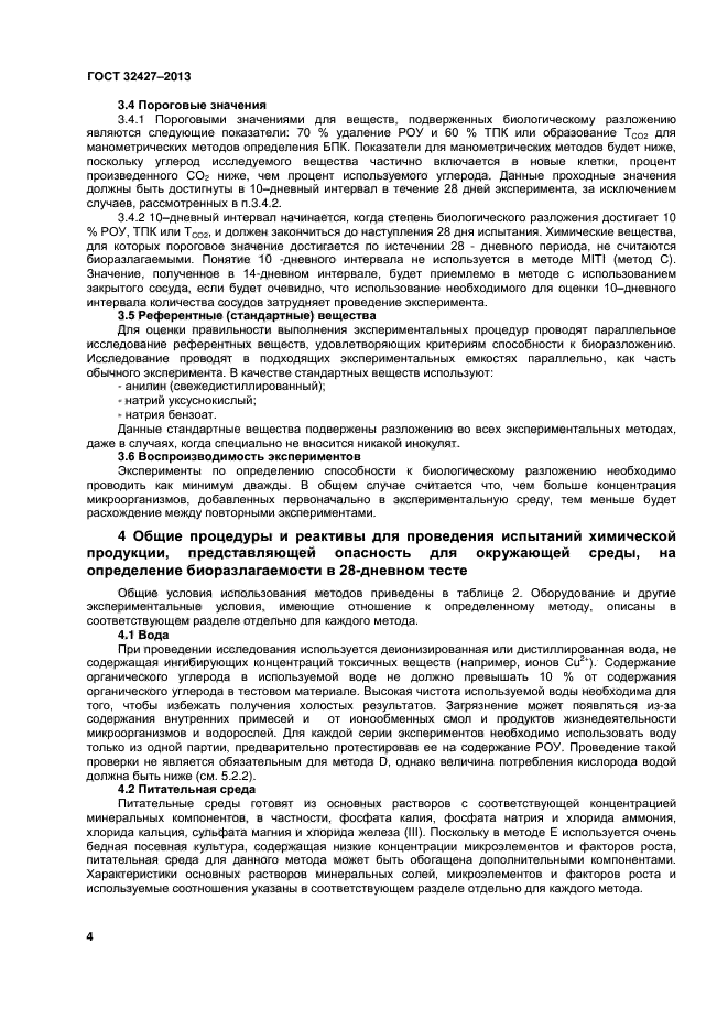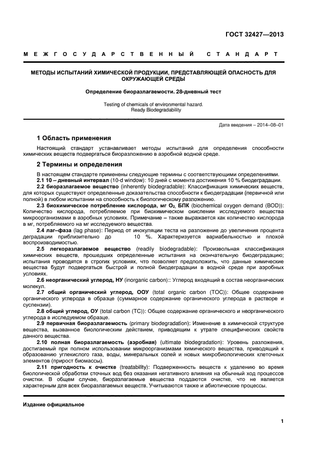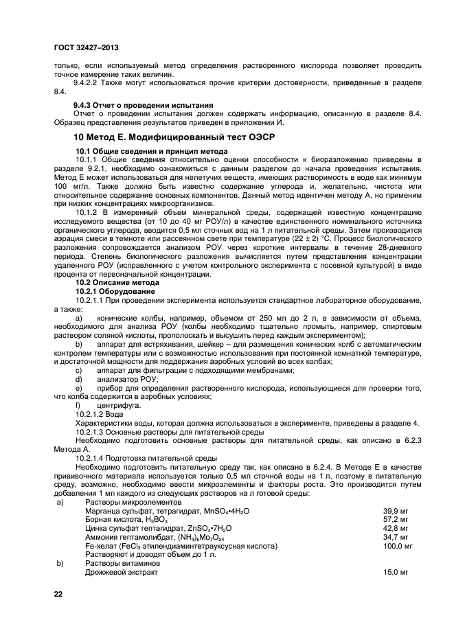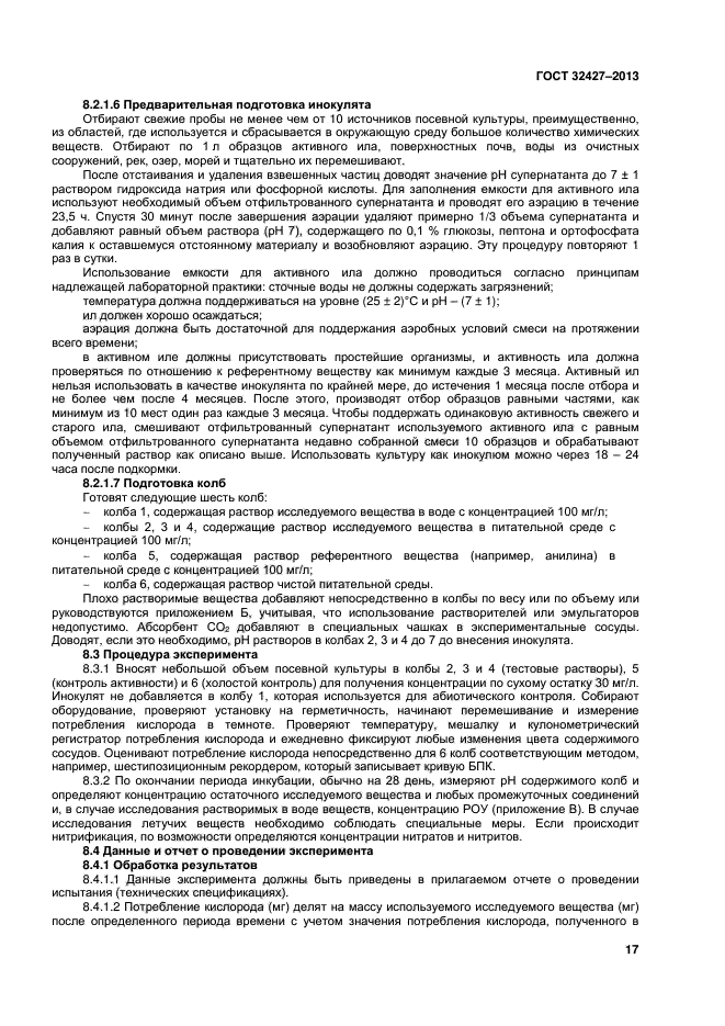 | Область и условия применения: | Настоящий стандарт устанавливает методы испытаний для определения способности химических веществ подвергаться биоразложению в аэробной водной среде |