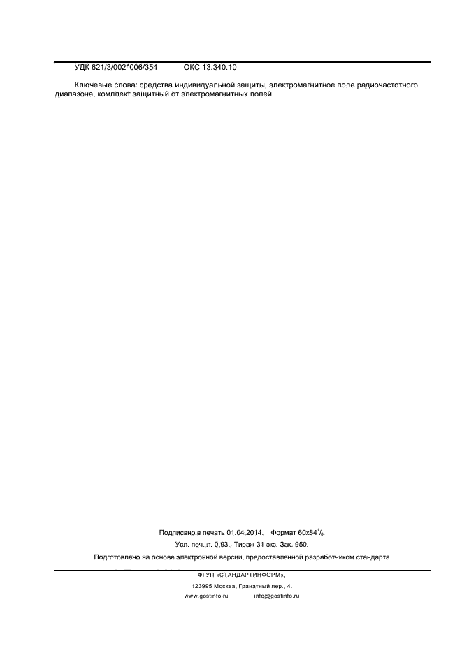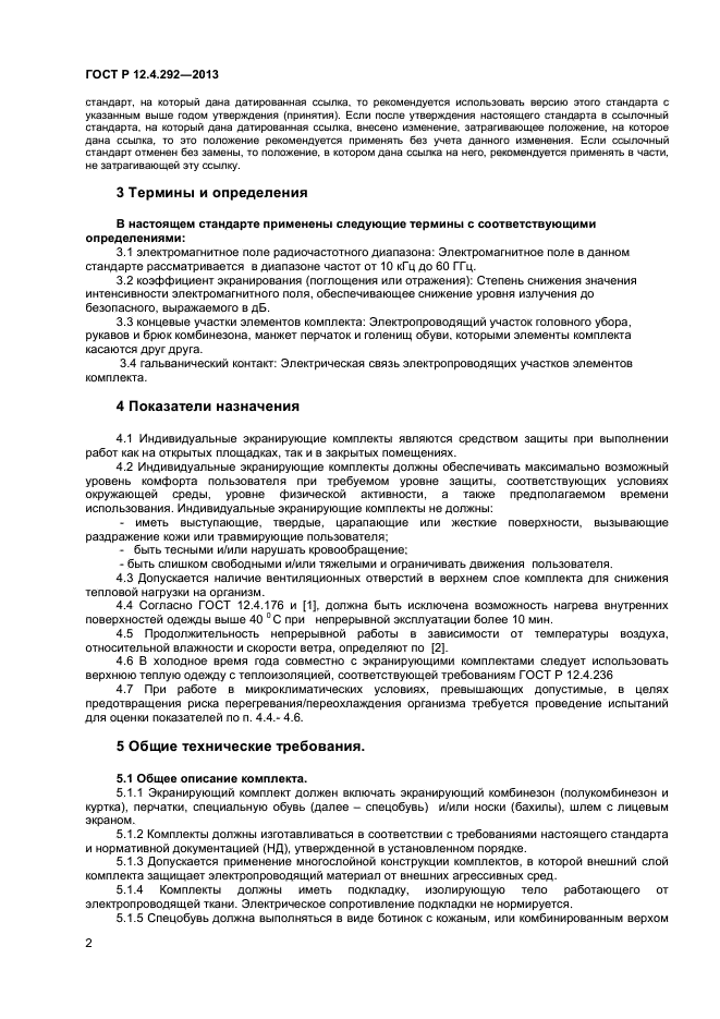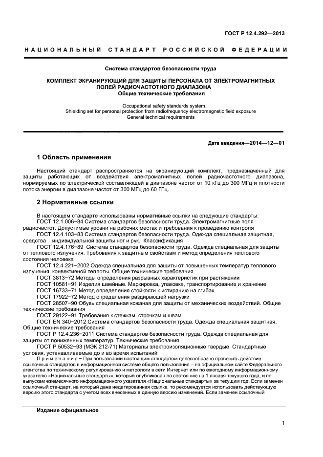 Настоящий стандарт распространяется на экранирующий комплект, предназначенный для защиты работающих от воздействия электромагнитных полей радиочастотного диапазона, нормируемых по электрической составляющей в диапазоне частот от 10 кГц до 300 МГц и плотности потока энергии в диапазоне частот от 300 МГц до 60 ГГц