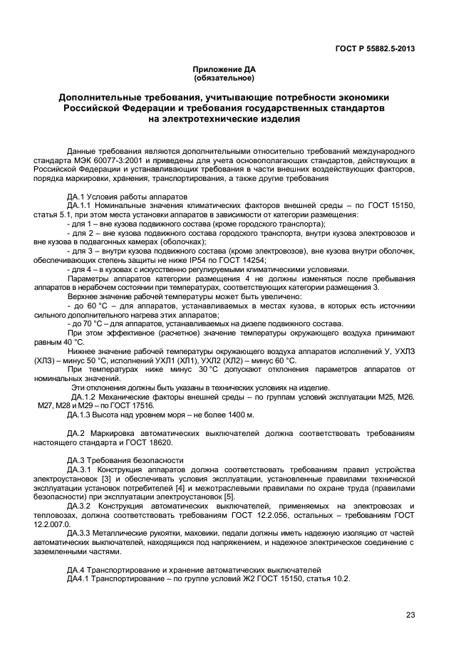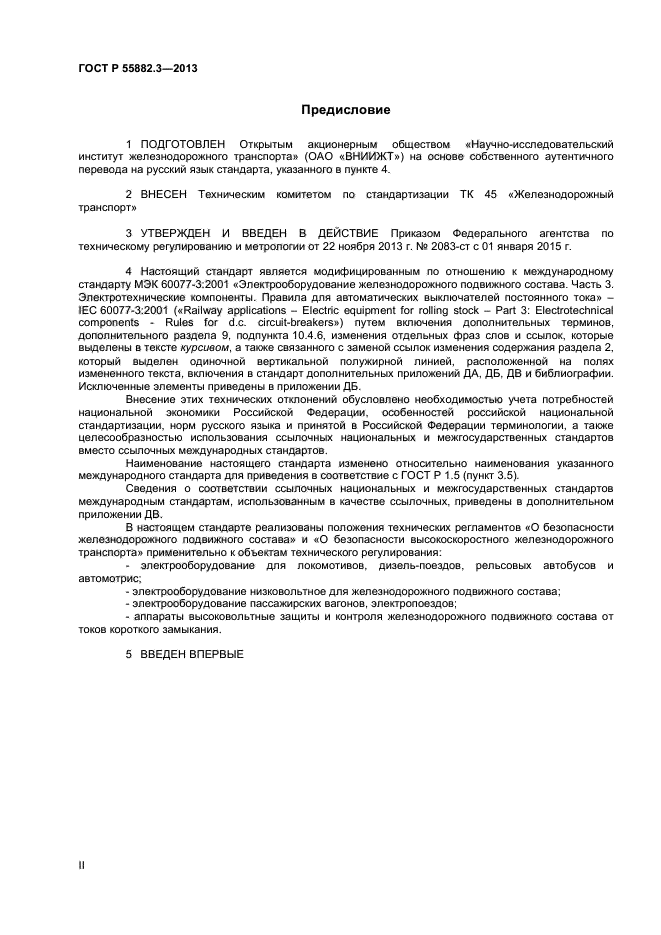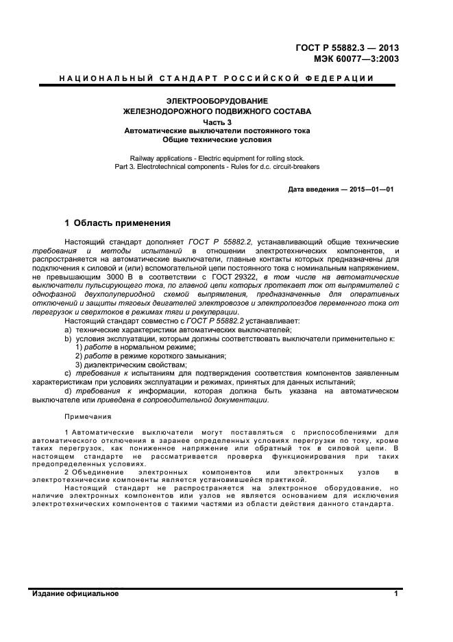 Настоящий стандарт дополняет ГОСТ Р 55882.2, устанавливающий общие технические требования и методы испытаний в отношении электротехнических компонентов, и распространяется на автоматические выключатели, главные контакты которых предназначены для подключения к силовой и (или) вспомогательной цепи постоянного тока с номинальным напряжением, не превышающим 3000 В в соответствии с ГОСТ 29322, в том числе на автоматические выключатели пульсирующего тока, по главной цепи которых протекает ток от выпрямителей с однофазной двухполупериодной схемой выпрямления, предназначенные для оперативных отключений и защиты тяговых двигателей электровозов и электропоездов переменного тока от перегрузок и сверхтоков в режимах тяги и рекуперации.