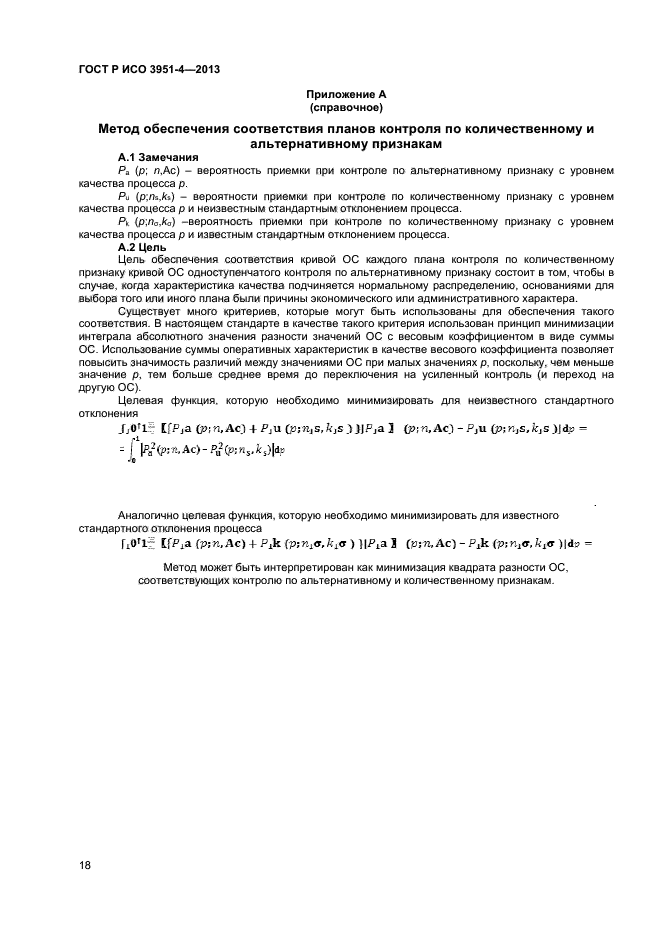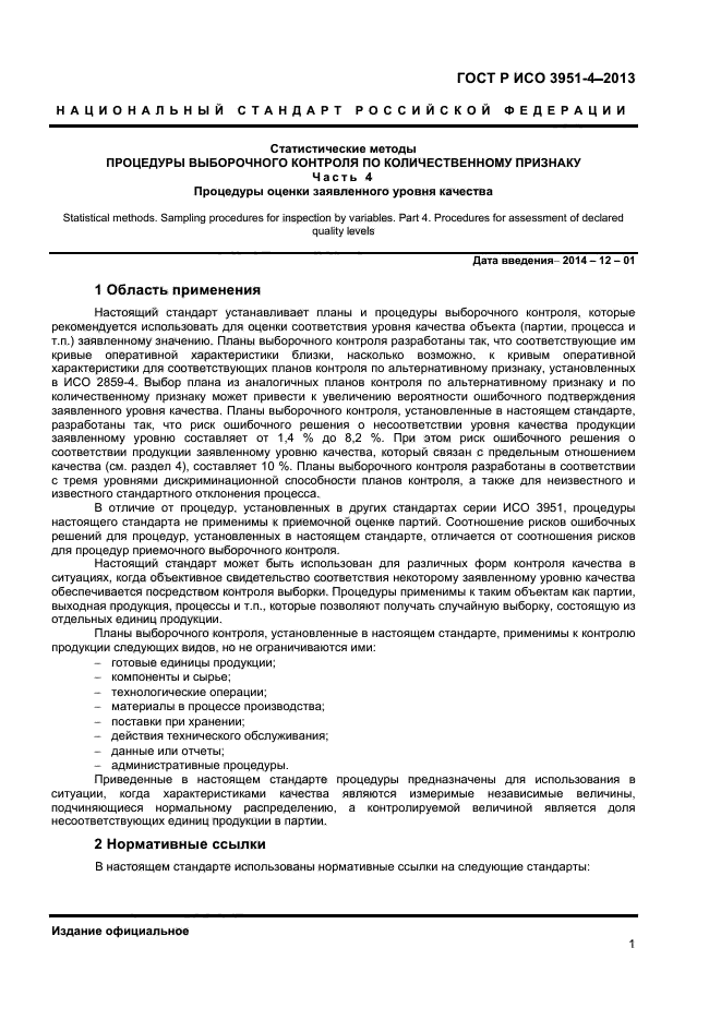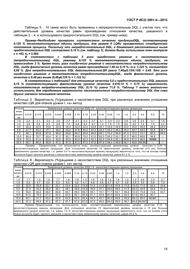 Настоящий стандарт устанавливает планы и процедуры выборочного контроля, которые рекомендуется использовать для оценки соответствия уровня качества объекта (партии, процесса и т.п.) заявленному значению. Планы выборочного контроля разработаны так, что соответствующие им кривые оперативной характеристики близки, насколько возможно, к кривым оперативной характеристики для соответствующих планов контроля по альтернативному признаку, установленных в ИСО 2859-4. Выбор плана из аналогичных планов контроля по альтернативному признаку и по количественному признаку может привести к увеличению вероятности ошибочного подтверждения заявленного уровня качества. Планы выборочного контроля, установленные в настоящем стандарте, разработаны так, что риск ошибочного решения о несоответствии уровня качества продукции заявленному уровню составляет от 1,4 % до 8,2 %. При этом риск ошибочного решения о соответствии продукции заявленному уровню качества, который связан с предельным отношением качества (см. раздел 4), составляет 10 %. Планы выборочного контроля разработаны в соответствии с тремя уровнями дискриминационной способности планов контроля, а также для неизвестного и известного стандартного отклонения процесса