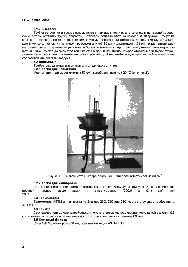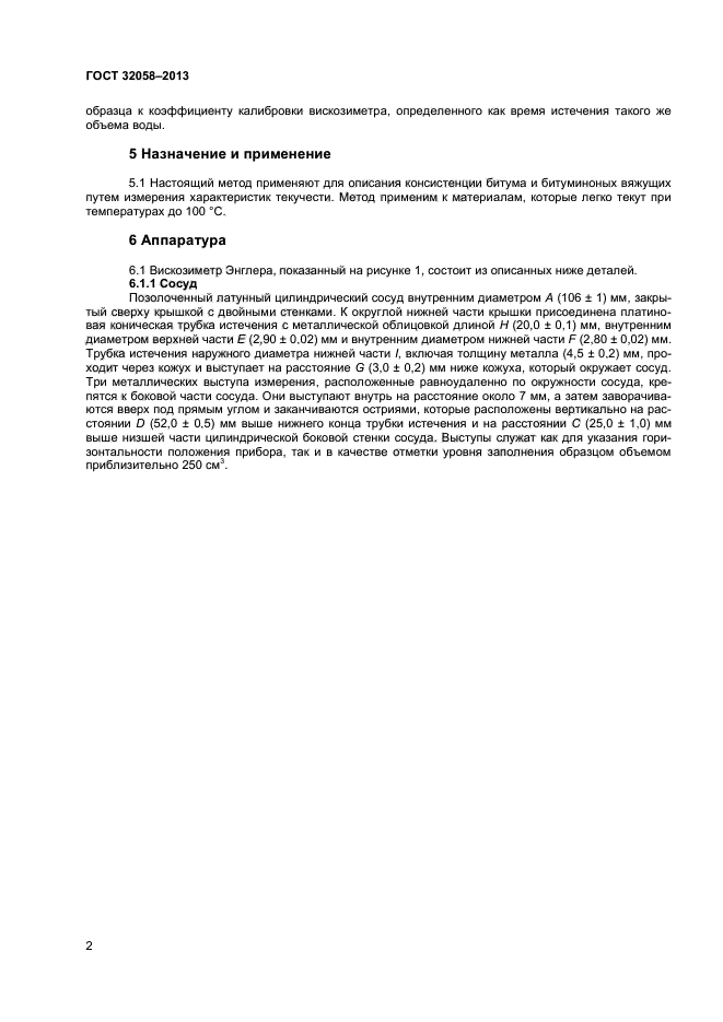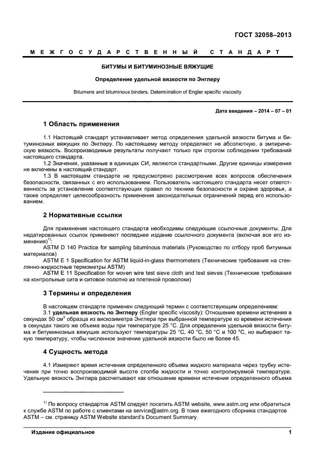 Настоящий стандарт устанавливает метод определения удельной вязкости битума и битуминозных вяжущих по Энглеру. По настоящему методу определяют не абсолютную, а эмпирическую вязкость. Воспроизводимые результаты получают только при строгом соблюдении требований настоящего стандарта.