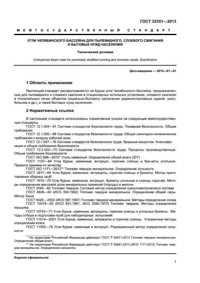 Настоящий стандарт распространяется на бурые угли Челябинского бассейна, предназначенные для пылевидного и слоевого сжигания в стационарных котельных установках, слоевого сжигания в отопительных печах объектов социально-бытового назначения (административных зданий, школ, больниц и др.), а также бытовых нужд населения