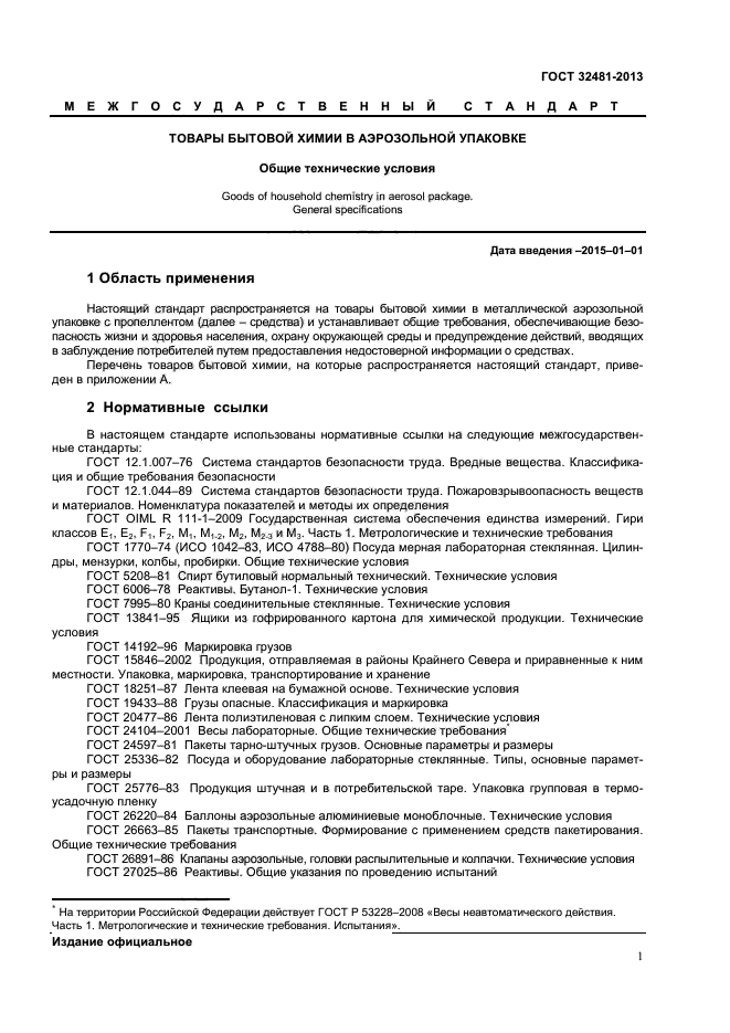 Настоящий стандарт распространяется на товары бытовой химии в металлической аэрозольной упаковке с пропеллентом (далее - средства) и устанавливает общие требования, обеспечивающие безопасность жизни и здоровья населения, охрану окружающей среды и предупреждение действий, вводящих в заблуждение потребителей путем предоставления недостоверной информации о средствах