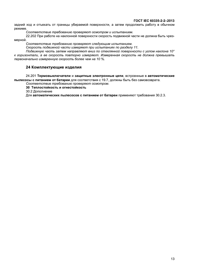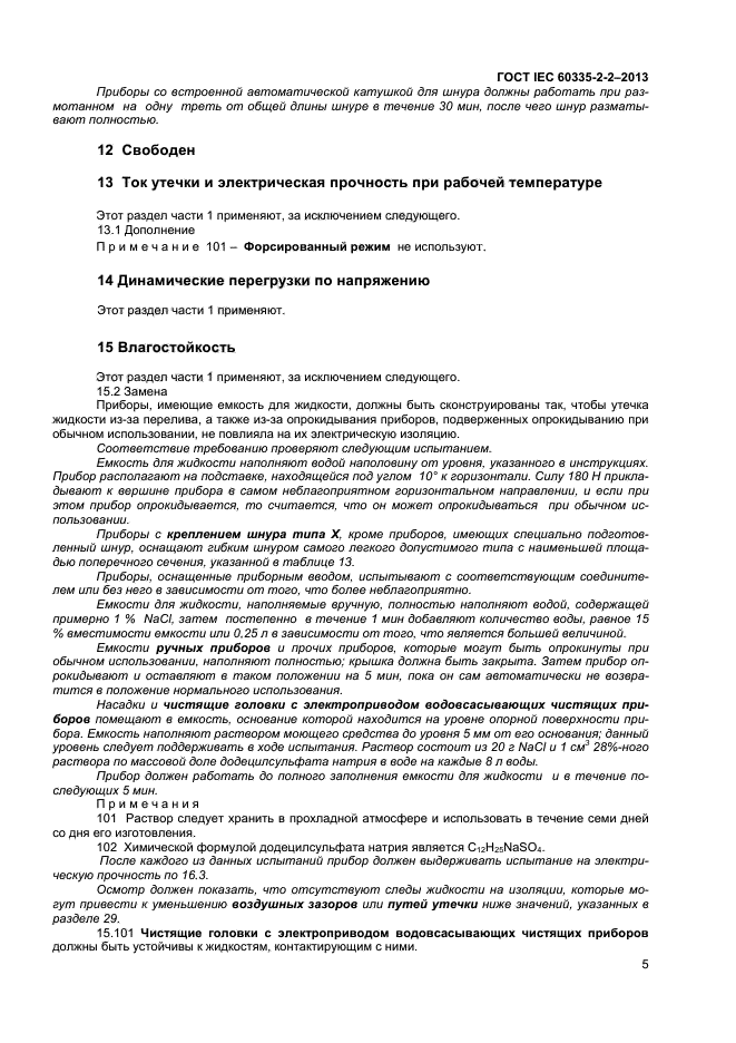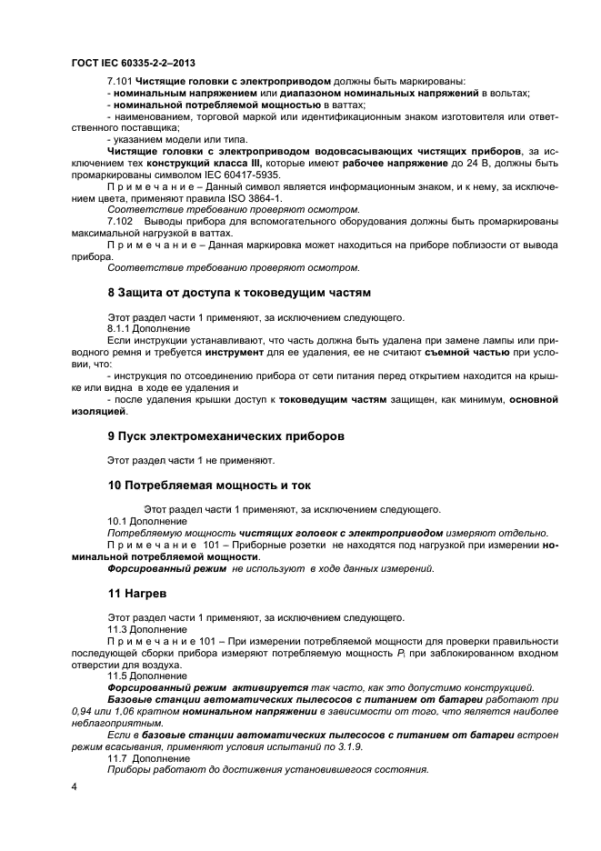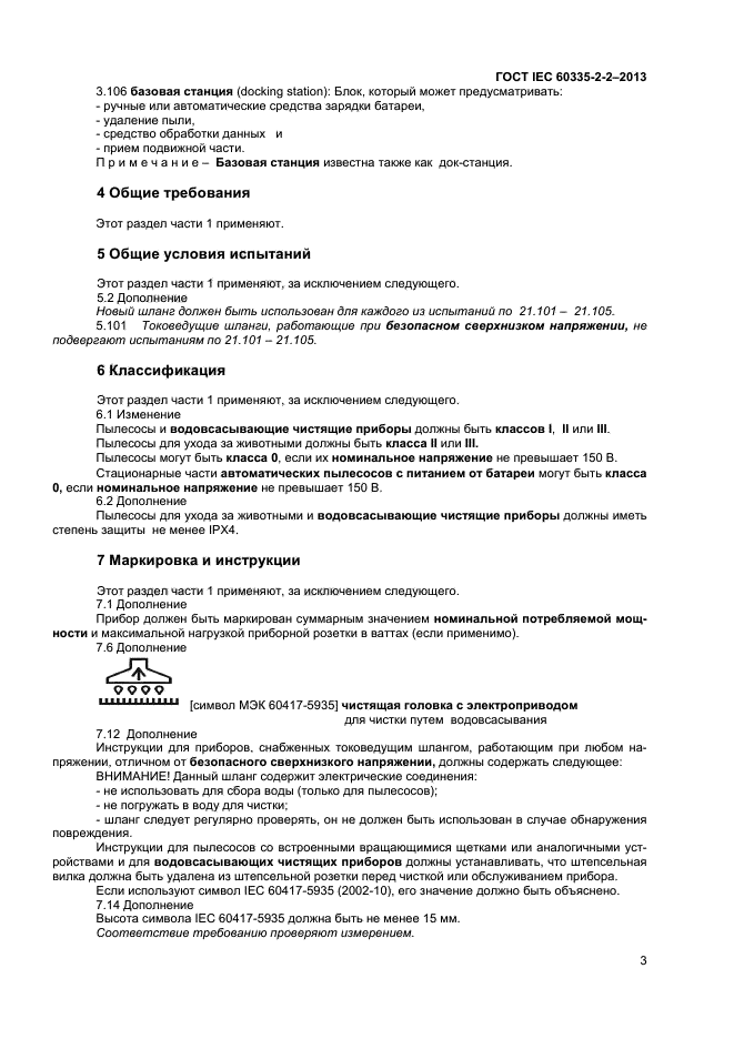 | Область и условия применения: | Настоящий стандарт устанавливает требования безопасности электрических пылесосов и водовсасывающих чистящих приборов для бытового и аналогичного применения, включая пылесосы для ухода за животными, номинальным напряжением не более 250 В. Требования безопасности также применяют к центральным пылесосам и автоматическим пылесосам с питанием от батареи.