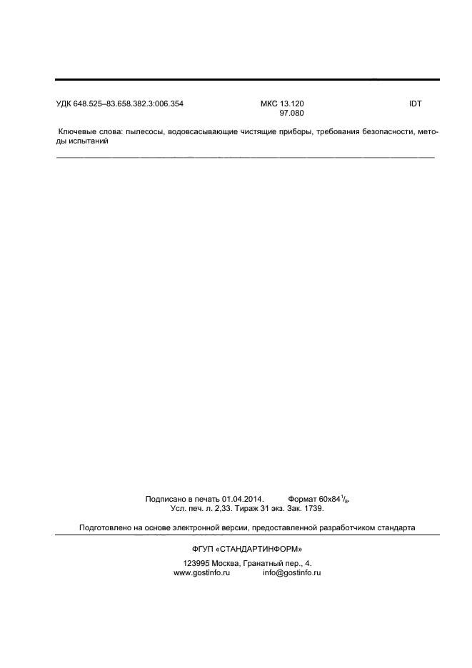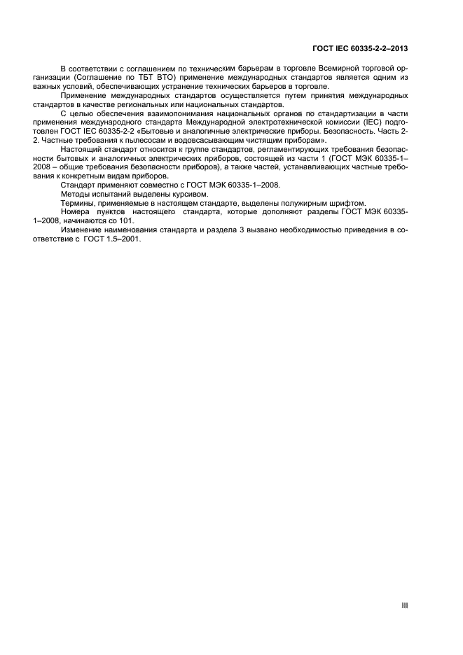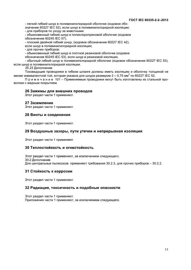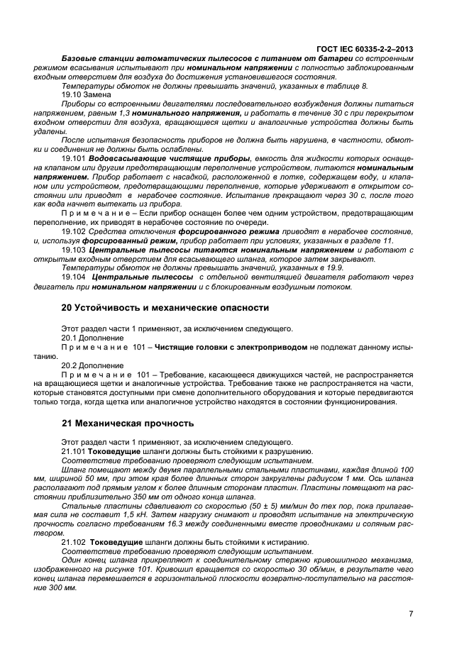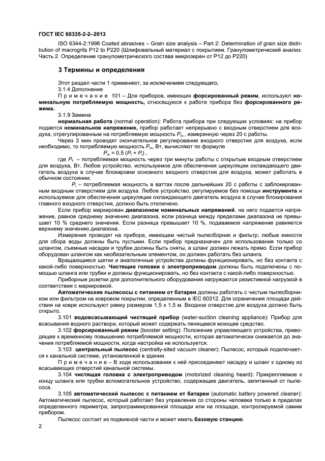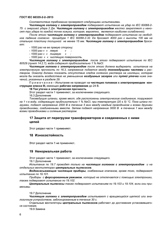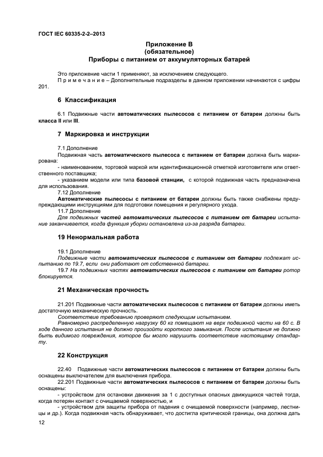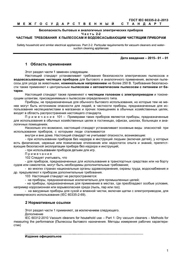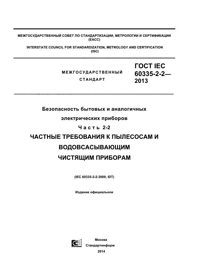 Настоящий стандарт устанавливает требования безопасности электрических пылесосов и водовсасывающих чистящих приборов для бытового и аналогичного применения, включая пылесосы для ухода за животными, номинальным напряжением не более 250 В. Требования безопасности также применяют к центральным пылесосам и автоматическим пылесосам с питанием от батареи.