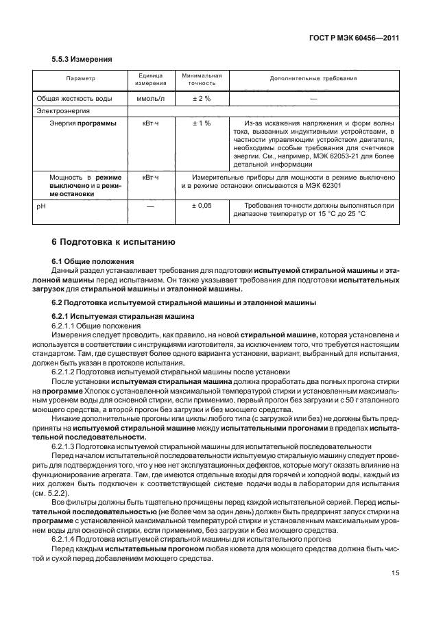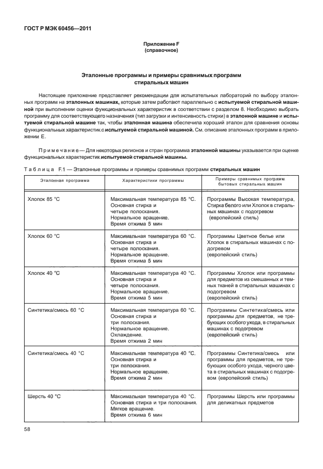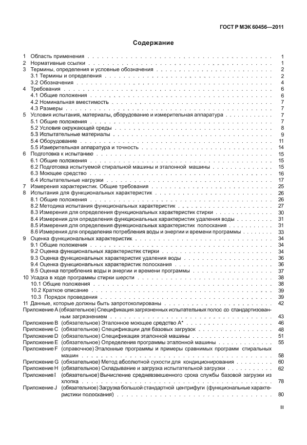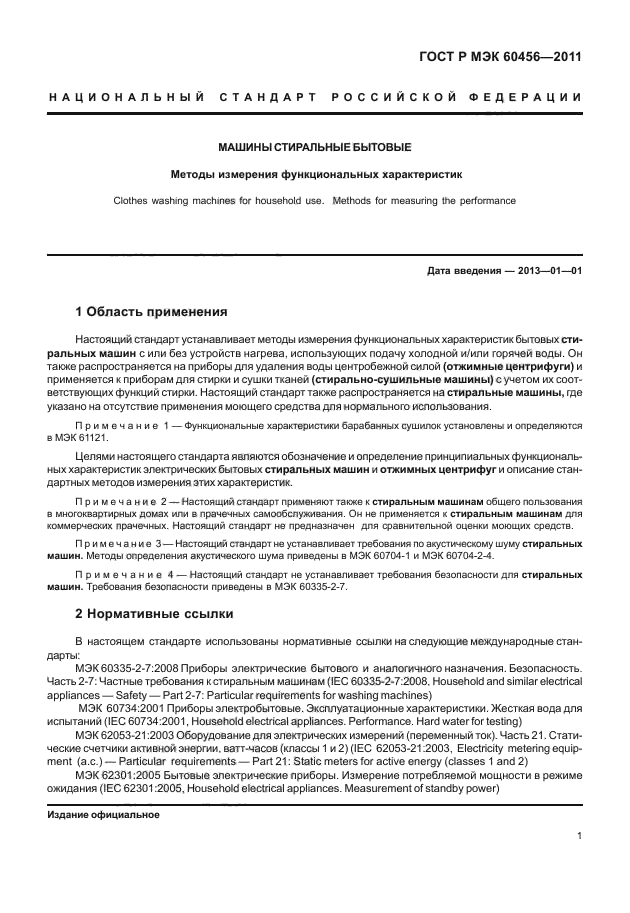 Настоящий стандарт устанавливает методы измерения функциональных характеристик бытовых стиральных машин с или без устройств нагрева, использующих подачу холодной и/или горячей воды. Он также распространяется на приборы для удаления воды центробежной силой (отжимные центрифуги) и применяется к приборам для стирки и сушки тканей (стирально-сушильные машины) с учетом их соответствующих функций стирки. Настоящий стандарт также распространяется на стиральные машины, где указано на отсутствие применения моющего средства для нормального использования.