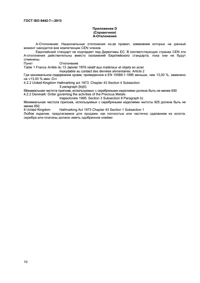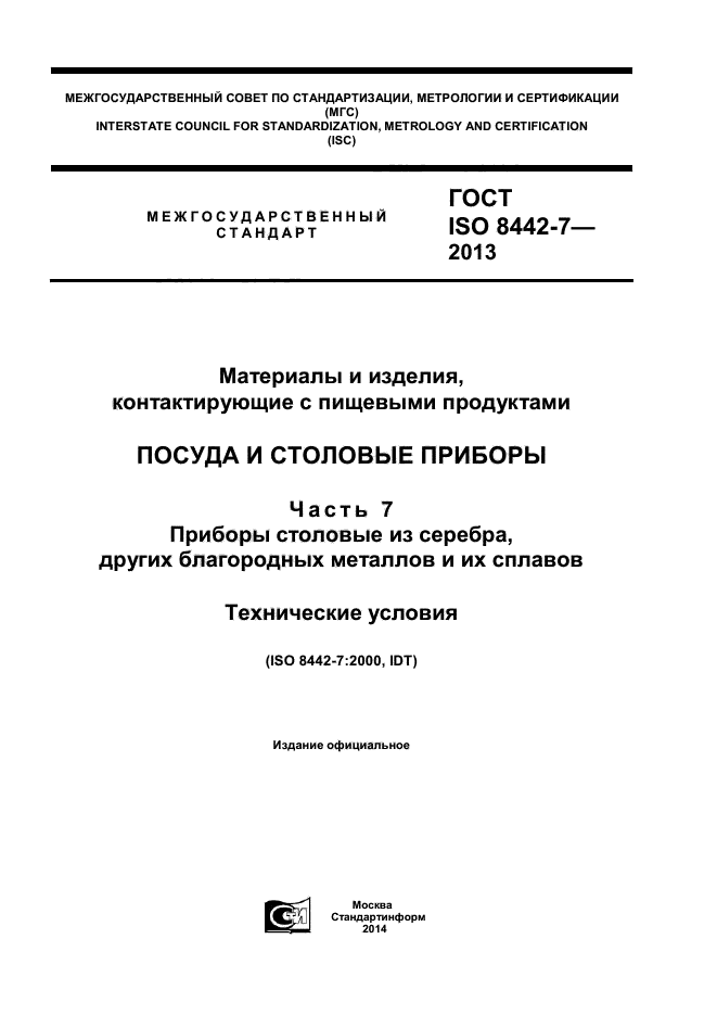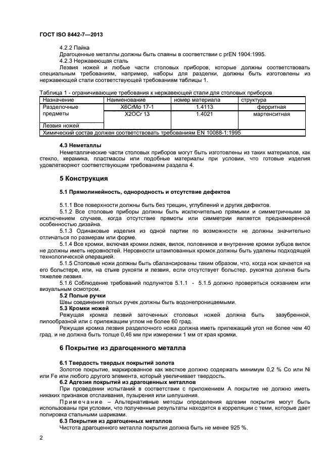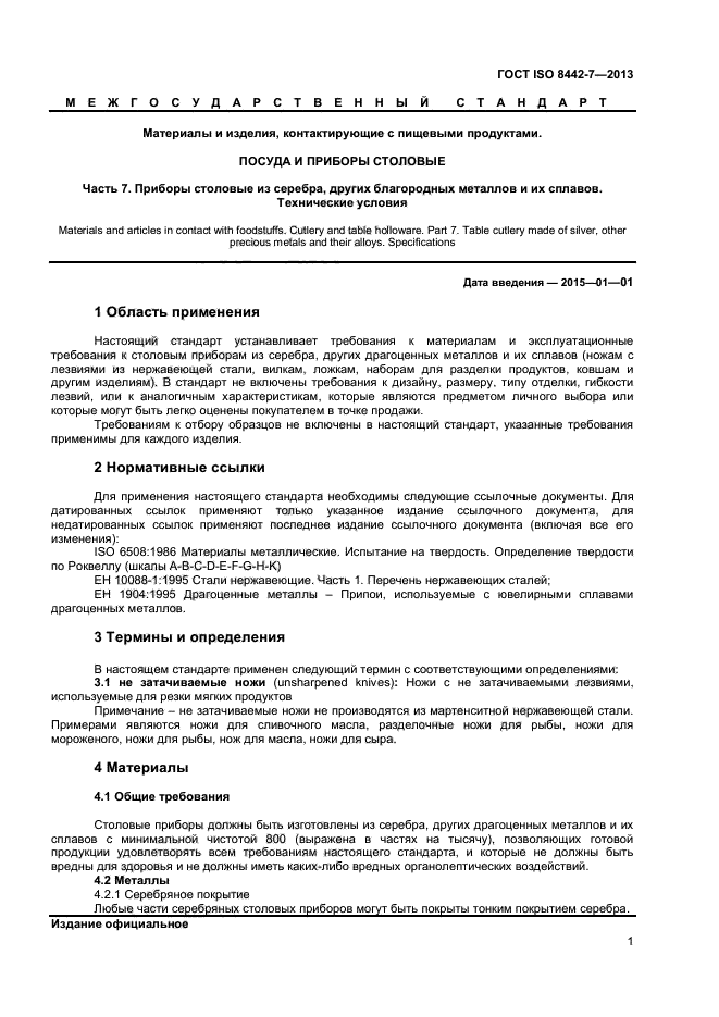 | Область и условия применения: | Настоящий стандарт устанавливает требования к материалам и эксплуатационные требования к столовым приборам из серебра, других драгоценных металлов и их сплавов (ножам с лезвиями из нержавеющей стали, вилкам, ложкам, наборам для разделки продуктов, ковшам и другим изделиям). В стандарт не включены требования к дизайну, размеру, типу отделки, гибкости лезвий, или к аналогичным характеристикам, которые являются предметом личного выбора или которые могут быть легко оценены покупателем в точке продажи.