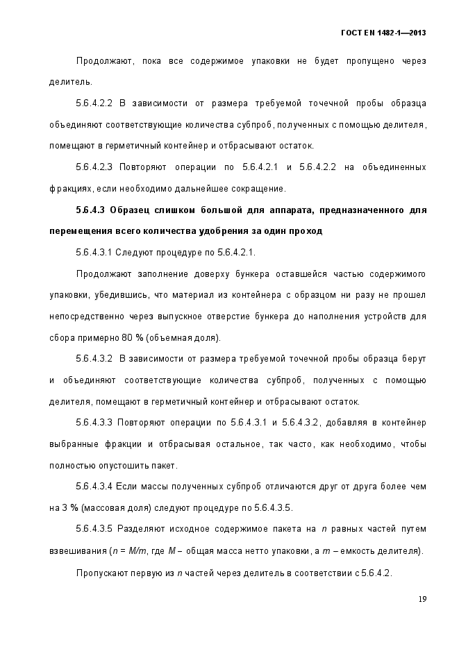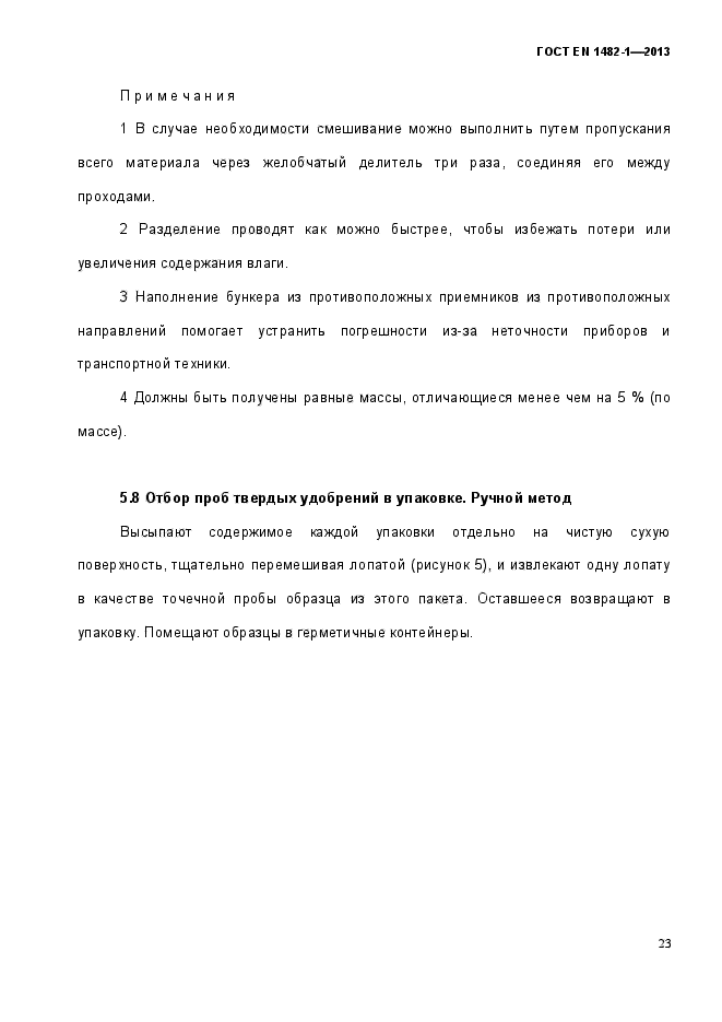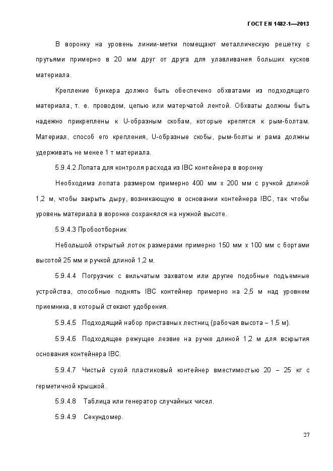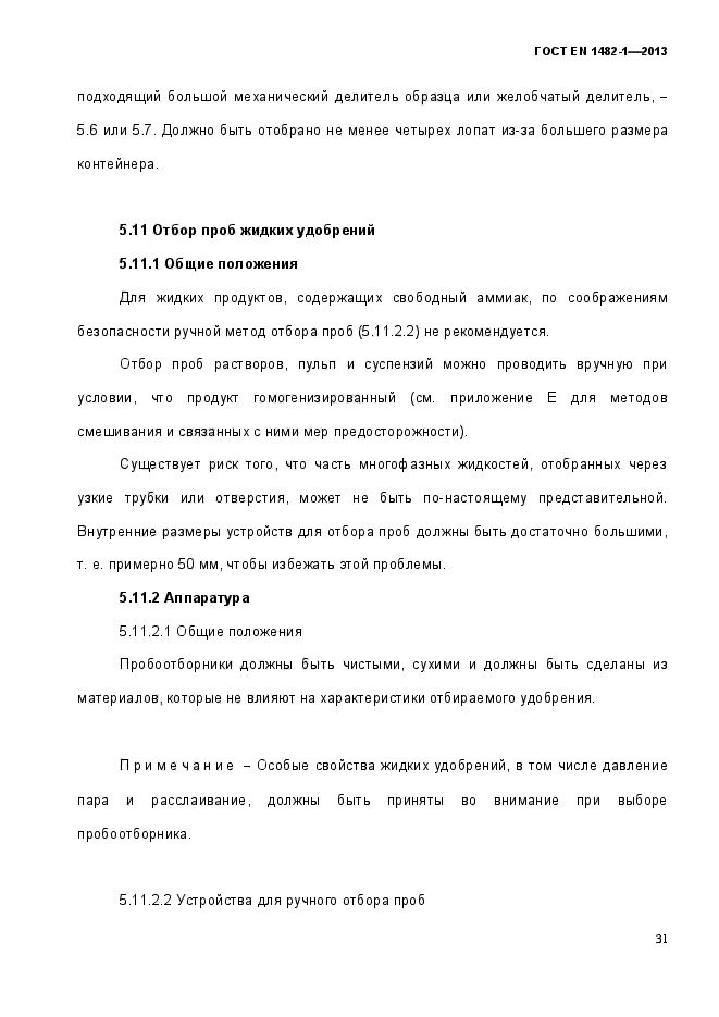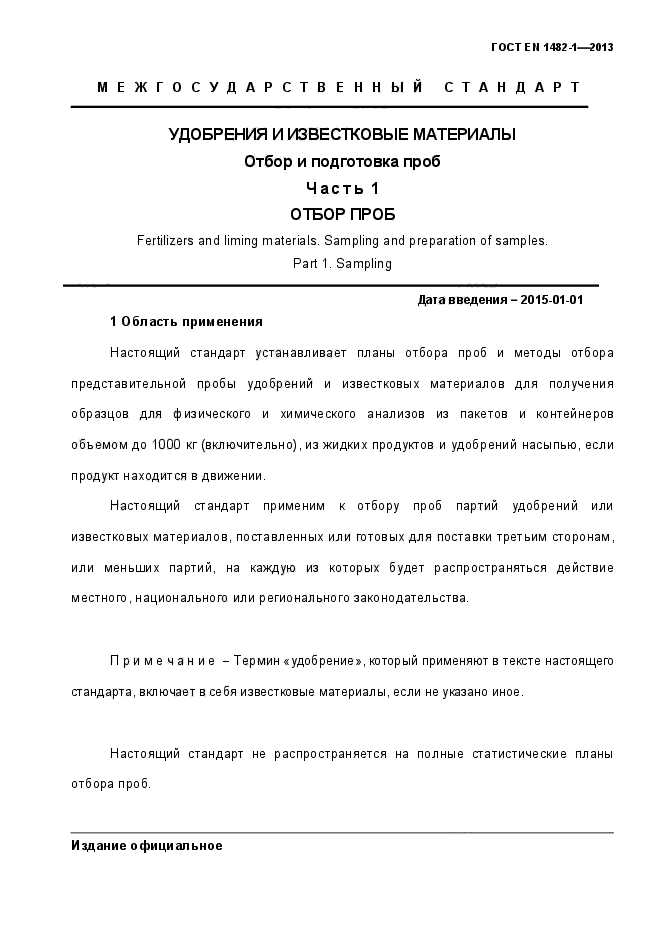 | Область и условия применения: | Настоящий стандарт устанавливает планы отбора проб и методы отбора представительной пробы удобрений и известковых материалов для получения образцов для физического и химического анализов из пакетов и контейнеров объемом до 1000 кг (включительно), из жидких продуктов и удобрений насыпью, если продукт находится в движении.