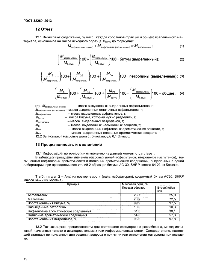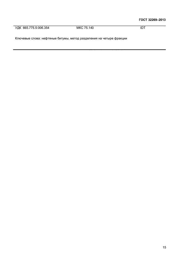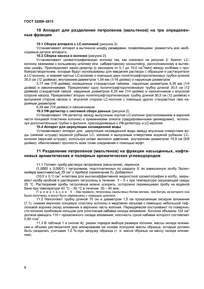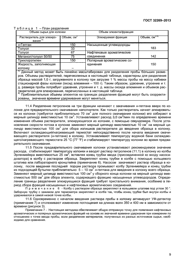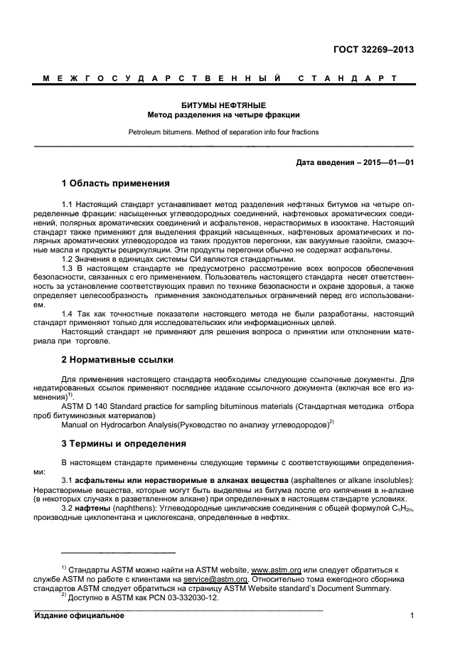 Настоящий стандарт устанавливает метод разделения нефтяных битумов на четыре определенные фракции: насыщенных углеводородных соединений, нафтеновых ароматических соединений, полярных ароматических соединений и асфальтенов, нерастворимых в изооктане. Настоящий стандарт также применяют для выделения фракций насыщенных, нафтеновых ароматических и полярных ароматических углеводородов из таких продуктов перегонки, как вакуумные газойли, смазочные масла и продукты рециркуляции. Эти продукты перегонки обычно не содержат асфальтены