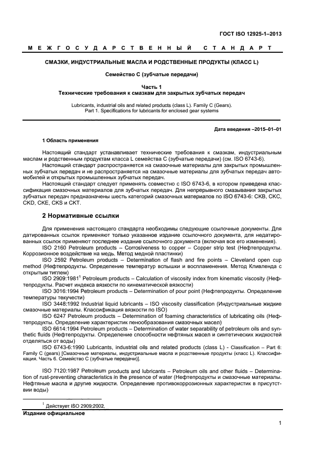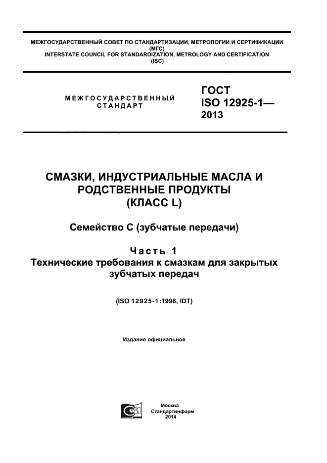 | Название рус.: | Смазки, индустриальные масла и родственные продукты (класс L). Семейство С (зубчатые передачи). Часть 1. Технические требования к смазкам для закрытых зубчатых передач |