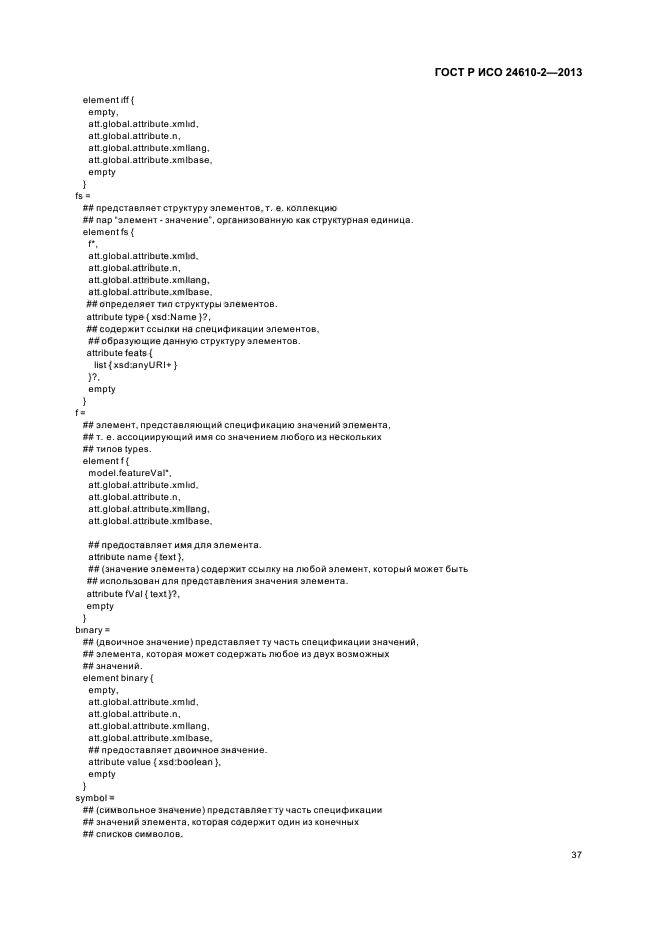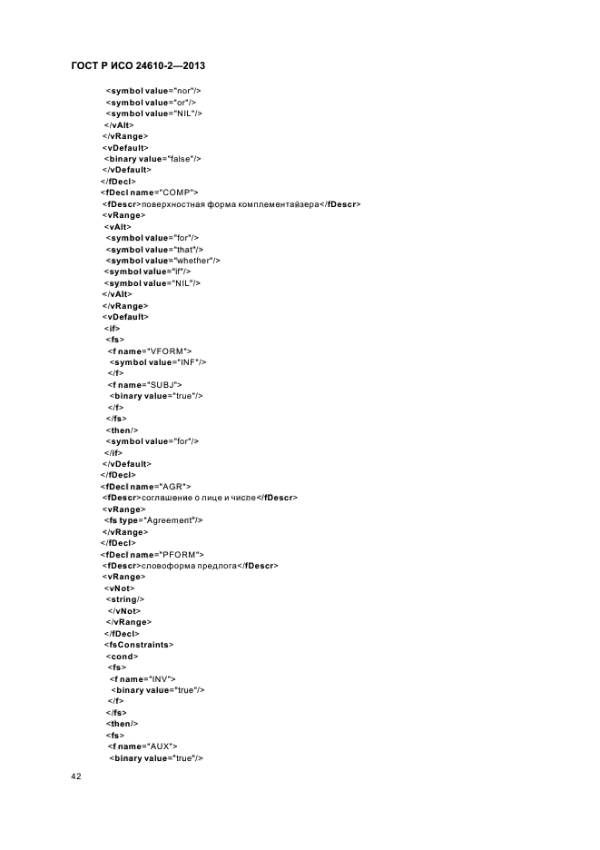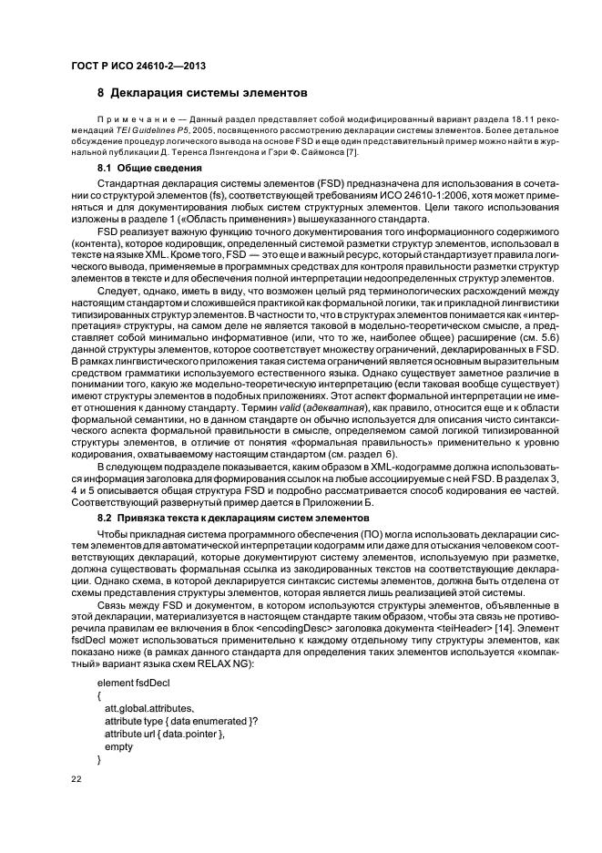 В настоящем стандарте предлагается формат представления, хранения и обмена для структур элементов в прикладных системах, основанных на использовании естественного языка, как для аннотирования, так и для формирования лингвистических данных. Основная цель состоит в том, чтобы предложить такой формат машинной обработки, который позволяет определить иерархию типов и декларировать ограничения, накладываемые на множество спецификаций элементов и на операции со структурами элементов, обеспечивая таким образом средства контроля соответствия каждой структуры элементов их базовой спецификации