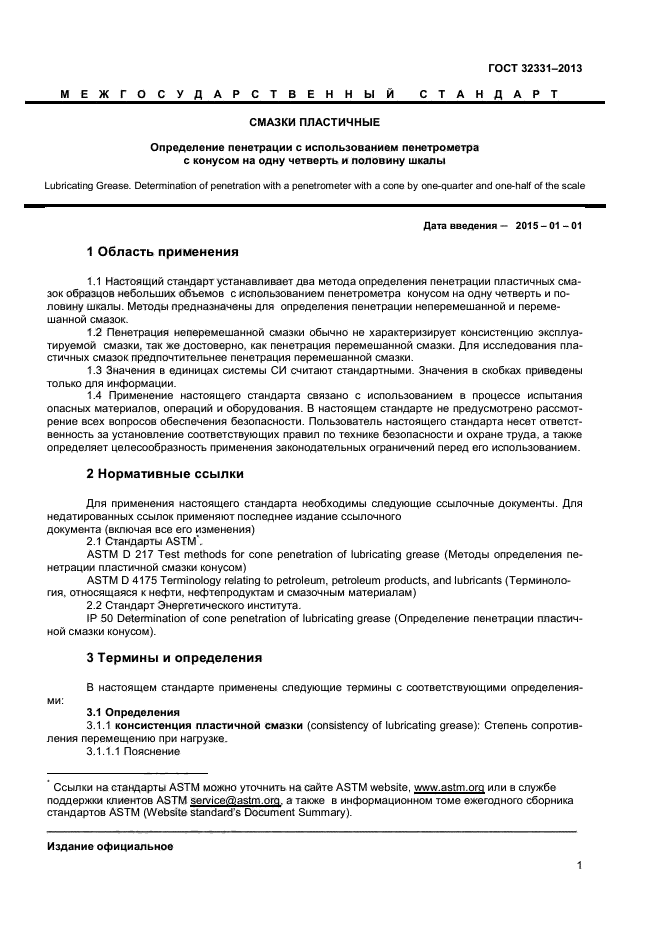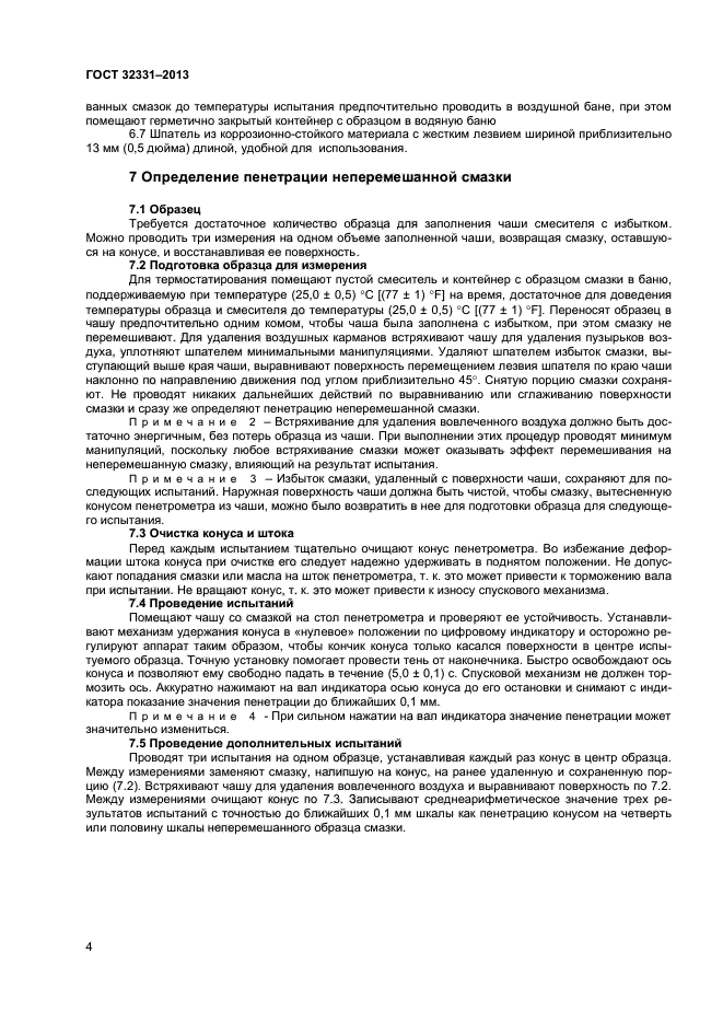 Настоящий стандарт устанавливает два метода определения пенетрации пластичных смазок образцов небольших объемов с использованием пенетрометра конусом на одну четверть и половину шкалы. Методы предназначены для определения пенетрации неперемешанной и перемешанной смазок.