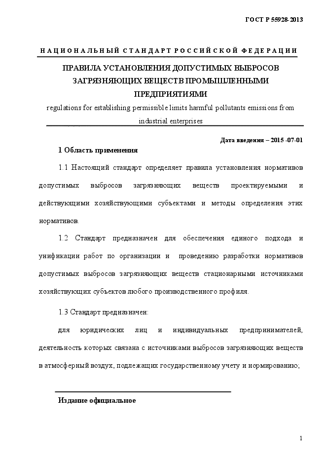 | Область и условия применения: | Настоящий стандарт определяет правила установления нормативов допустимых выбросов загрязняющих веществ проектируемыми и действующими хозяйствующими субъектами и методы определения этих нормативов.