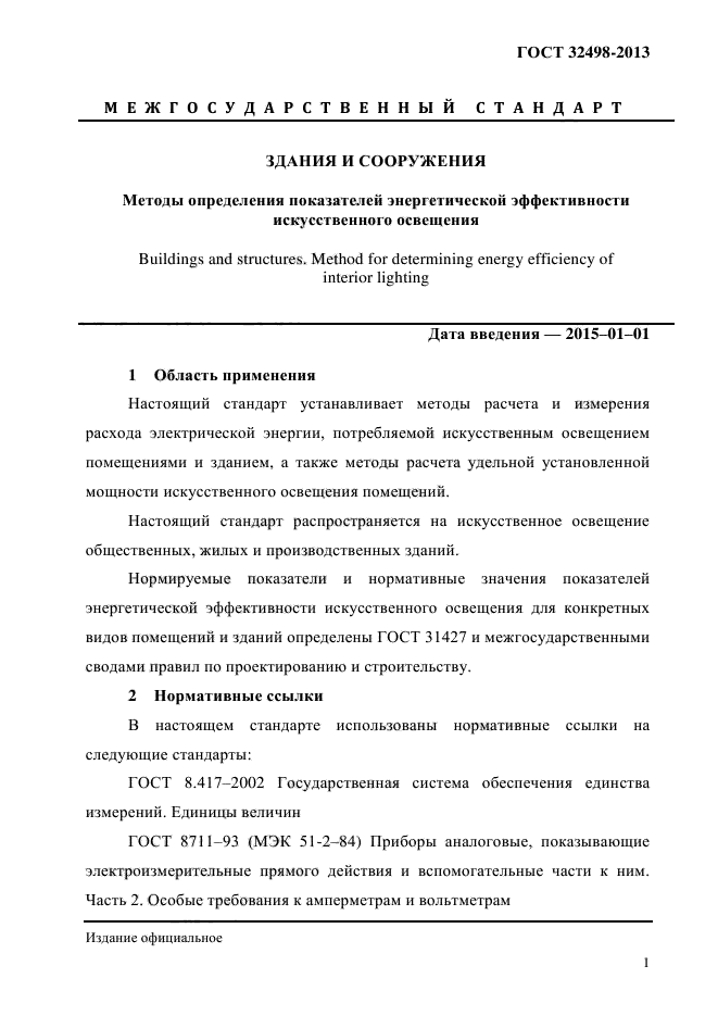 | Область и условия применения: | Настоящий стандарт устанавливает методы расчета и измерения расхода электрической энергии, потребляемой искусственным освещением помещениями и зданием, а также методы расчета удельной установленной мощности искусственного освещения помещений.