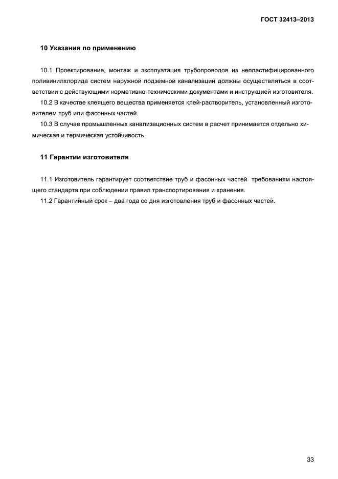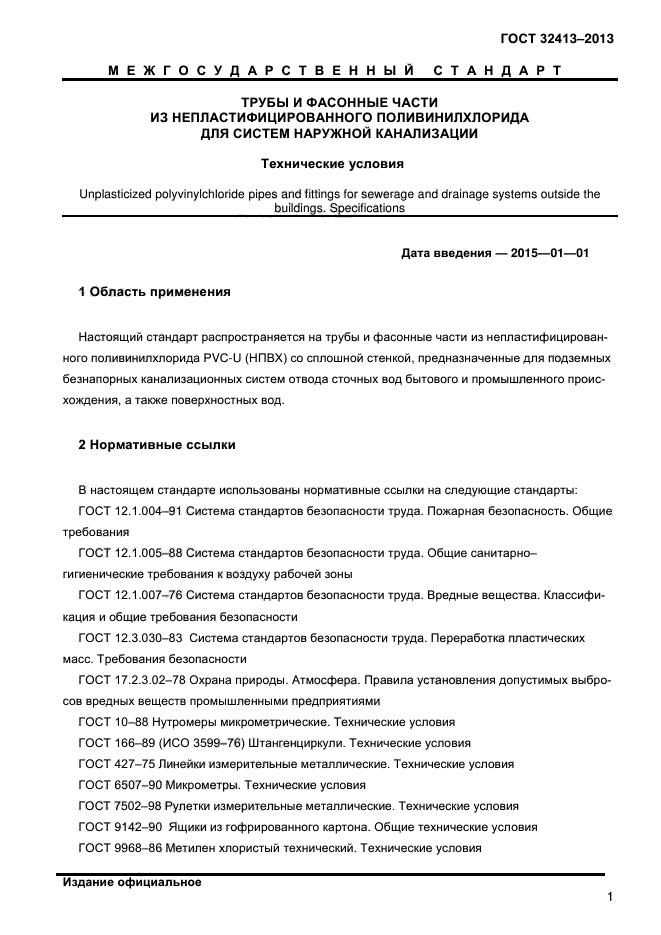 Настоящий стандарт распространяется на трубы и фасонные части из непластифицированного поливинилхлорида РVС-U (НПВХ) со сплошной стенкой, предназначенные для подземных безнапорных канализационных систем отвода сточных вод бытового и промышленного происхождения, а также поверхностных вод