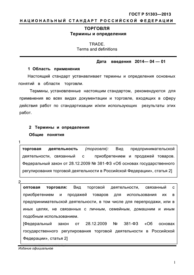 | Область и условия применения: | Настоящий стандарт устанавливает термины и определения основных понятий в области торговли.