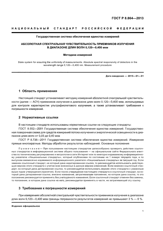| Область и условия применения: | Настоящий стандарт устанавливает методику измерений абсолютной спектральной чувствительности (далее - АСЧ) приемников излучения в диапазоне длин волн 0,120 - 0,400 мкм, используемых для контроля характеристик ультрафиолетового излучения, а также устанавливает требования к погрешности измерений |