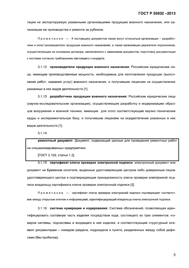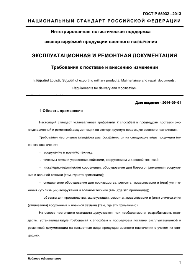 Требования настоящего стандарта распространяются на следующие виды продукции военного назначения: - вооружение и военную технику; - системы связи и управления войсками, вооружением и военной техникой; - инженерно-технические сооружения, оборудование для боевого применения вооружения и военной техники (там, где это применимо); - специальное оборудование для производства, ремонта, модернизации и (или) уничтожения (утилизации) вооружения и военной техники (там, где это применимо); - объекты для производства, эксплуатации, ремонта, модернизации и (или) уничтожения (утилизации) вооружения и военной техники (там, где это применимо). На основе настоящего стандарта допускается, при необходимости, разрабатывать стандарты, устанавливающие требования к способам и процедурам поставки эксплуатационной и ремонтной документации на конкретные виды продукции военного назначения с учетом их специфики |