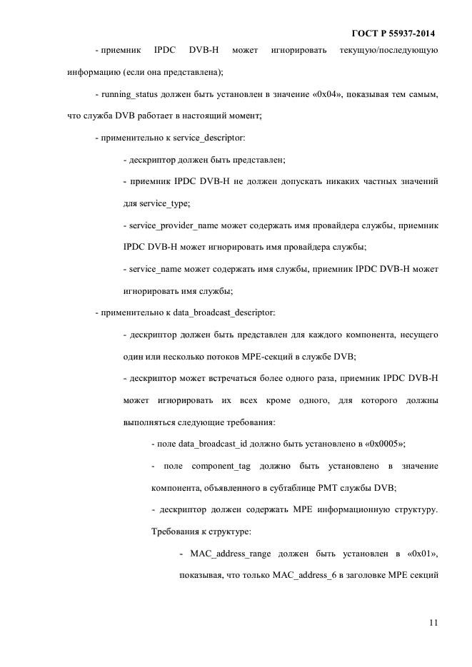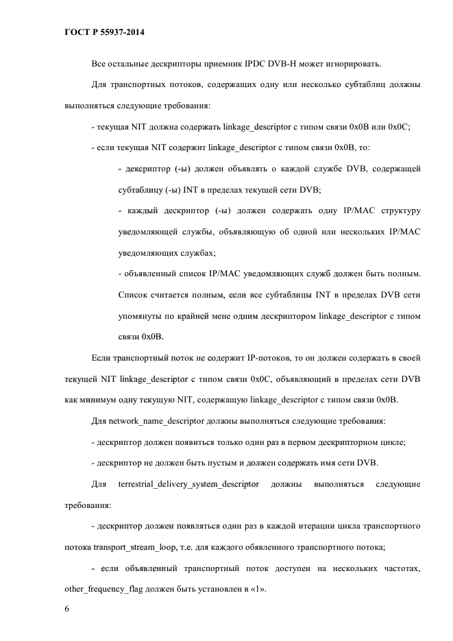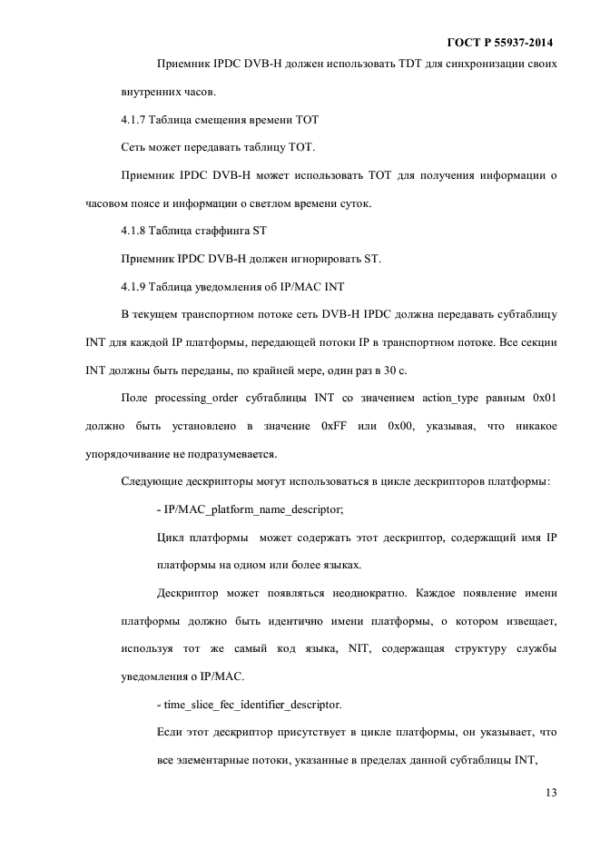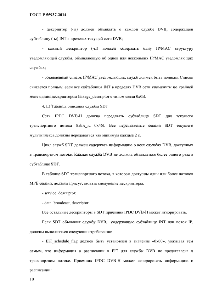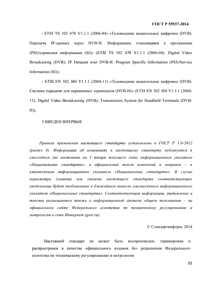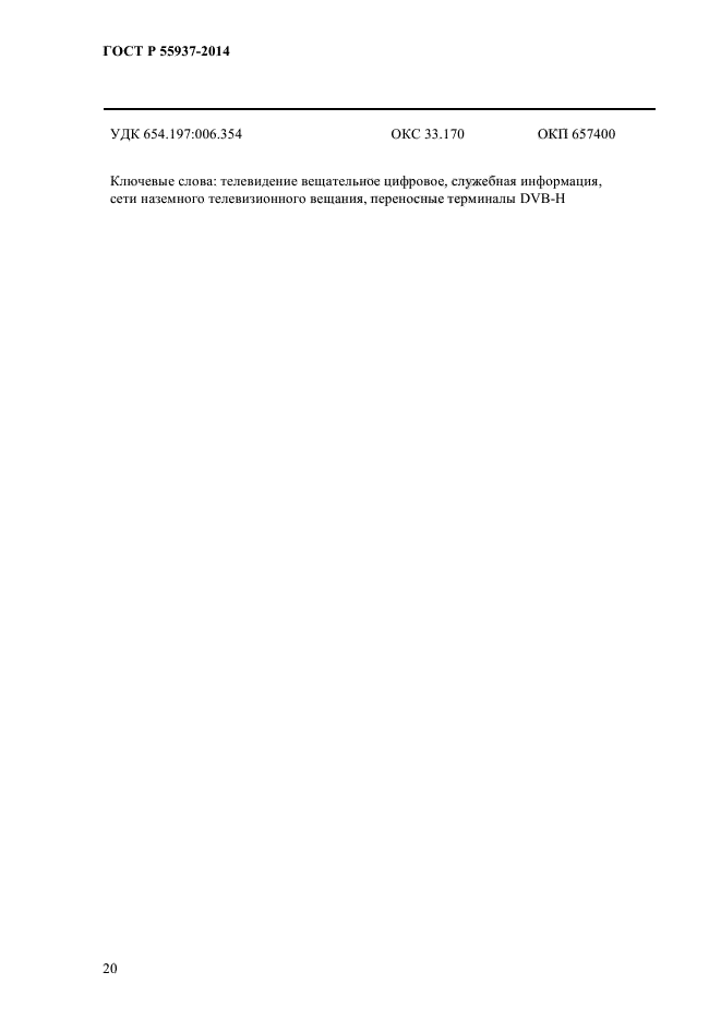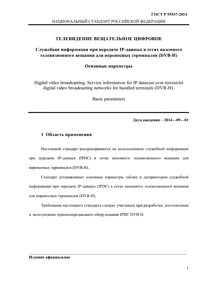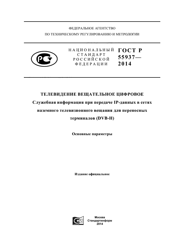 | Область и условия применения: | Настоящий стандарт распространяется на использование служебной информации при передаче IP-данных (IPDC) в сетях наземного телевизионного вещания для переносных терминалов (DVB-H).