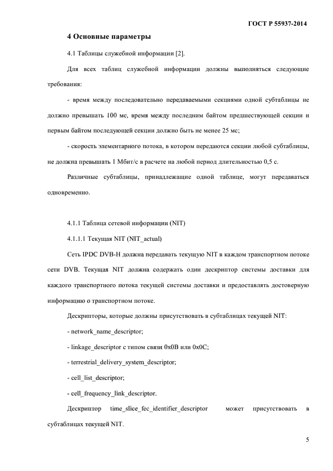 Стандарт устанавливает основные параметры таблиц и дескрипторов служебной информации при передаче IP-данных (IPDC) в сетях наземного телевизионного вещания для переносных терминалов (DVB-H). Требования настоящего стандарта следует учитывать при разработке, изготовлении и эксплуатации приемопередающего оборудования IPDC DVB-H |