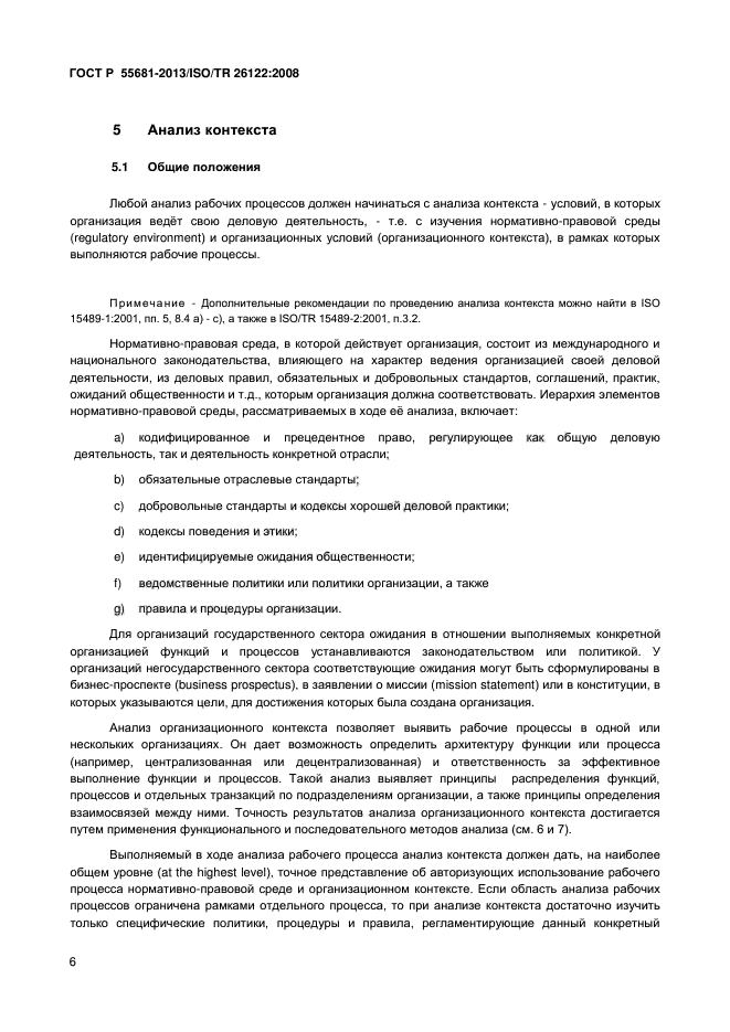 В стандарте описаны два вида анализа, а именно: a) функциональный анализ (декомпозиция деловых функций на процессы), и b) анализ последовательности выполнения работ (изучение потоков транзакций). Каждый вид анализа подразумевает предварительное изучение соответствующего контекста (т.е. целей и задач организации, законодательно-нормативной среды). Отдельные элементы анализа могут выполняться в различных сочетаниях и в порядке, отличающегося от описанного в стандарте - в зависимости от особенностей задачи, масштабов проекта и цели проводимого анализа. Рекомендации и указания даны в виде списков вопросов/тем, которые следует рассмотреть при использовании соответствующего элемента анализа. Настоящий стандарт описывает применение на практике теоретических положений, содержащихся в стандарте ГОСТ Р ИСО 15489-1. Сам по себе стандарт технологически-нейтрален (т.е. его можно применять независимо от особенностей технологической среды), хотя его можно также использовать для оценки адекватности технологических инструментов, поддерживающих рабочие процессы организации |