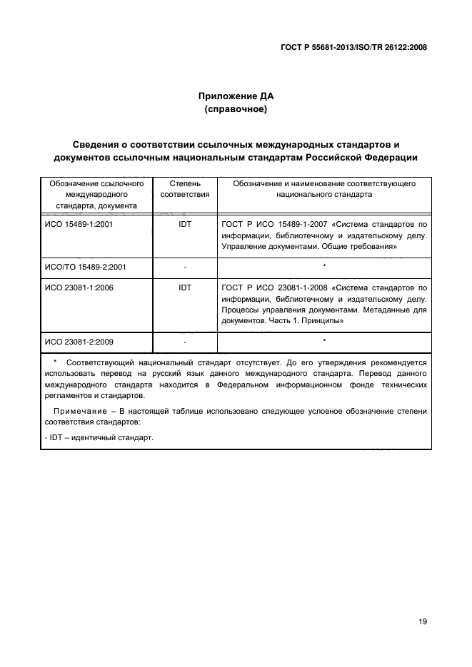 Настоящий стандарт описывает применение на практике теоретических положений, содержащихся в стандарте ГОСТ Р ИСО 15489-1. Сам по себе стандарт технологически-нейтрален (т.е. его можно применять независимо от особенностей технологической среды), хотя его можно также использовать для оценки адекватности технологических инструментов, поддерживающих рабочие процессы организации