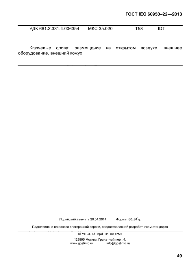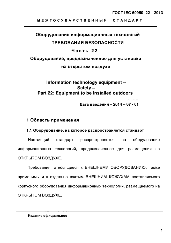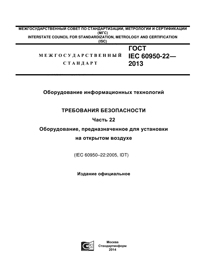 | Название рус.: | Оборудование информационных технологий. Требования безопасности. Часть 22. Оборудование, предназначенное для установки на открытом воздухе |