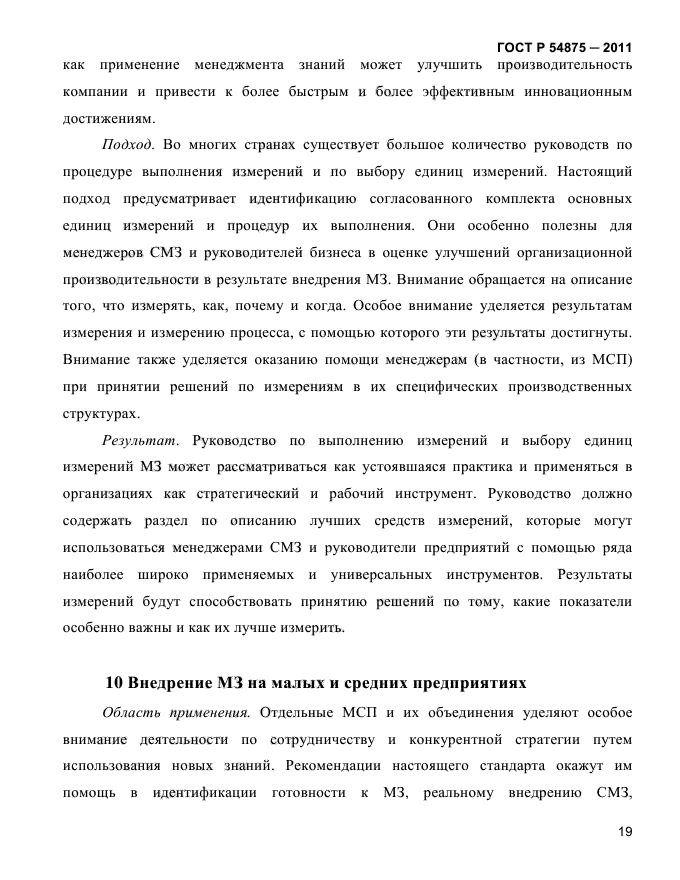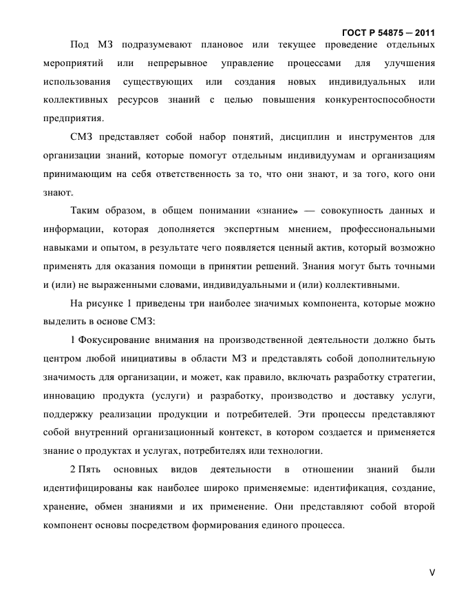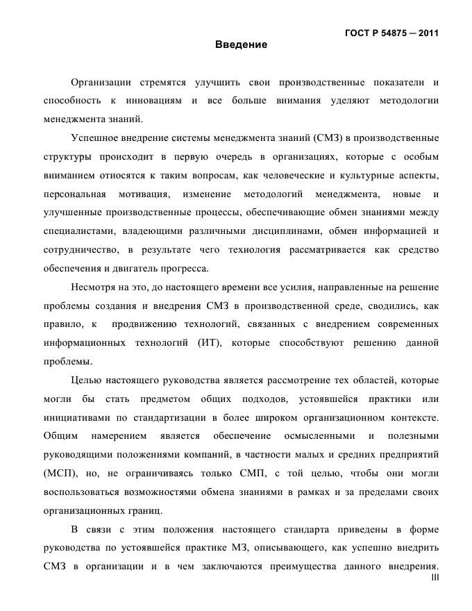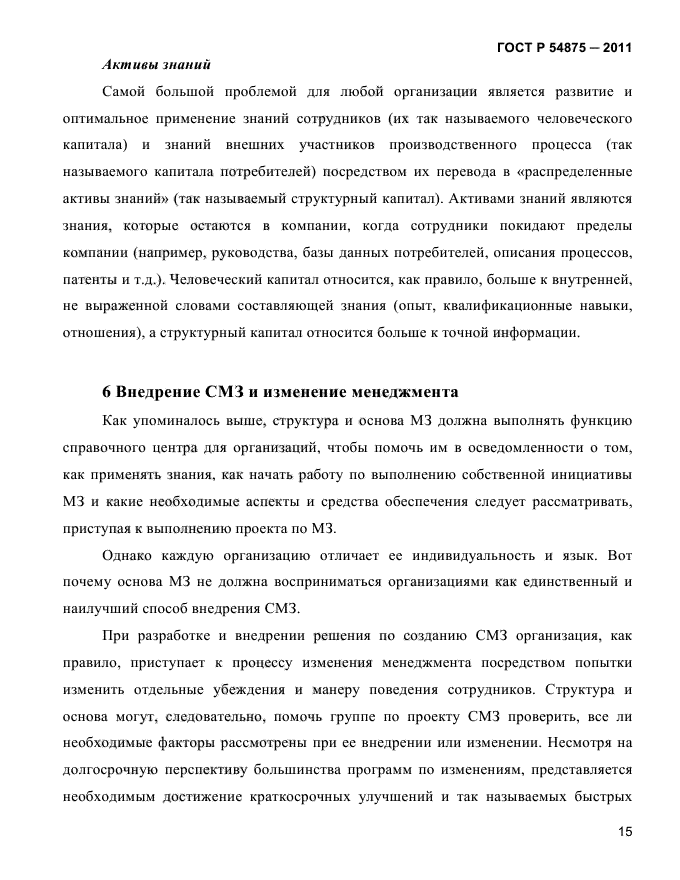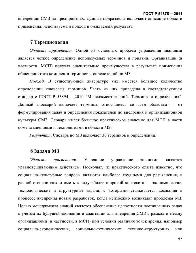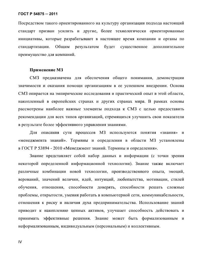 Первоочередной задачей каждой организации является поставка продукта и (или) услуги своим потребителям или, если речь идет о правительственной организации, - своим гражданам. Для выполнения этой задачи менеджеры и сотрудники организации применяют свои личностные знания, являющиеся объектом интеллектуальной собственности или ноухау, знание организации, знание своих поставщиков, партнеров и клиентов с помощью процесса взаимодействия и сотрудничества. Применение знания само по себе не является чемто новым. СМЗ должна строиться на существующих видах деятельности, улучшая их, и обеспечивать большую осведомленность всех участников о роли знаний в производственных и организационных процессах