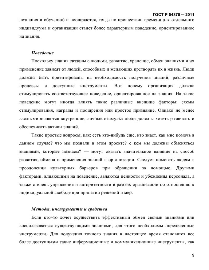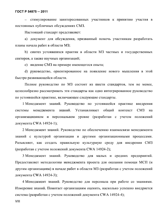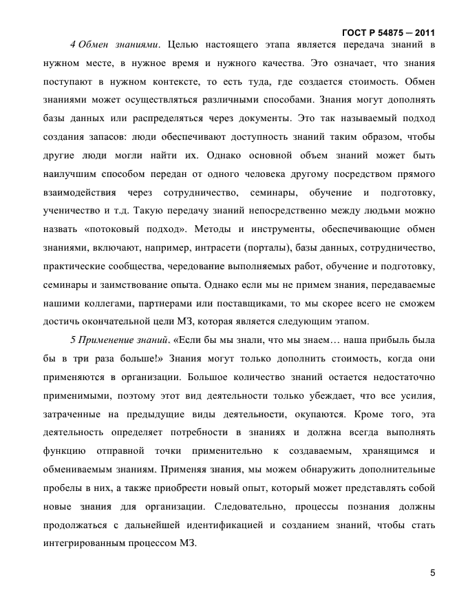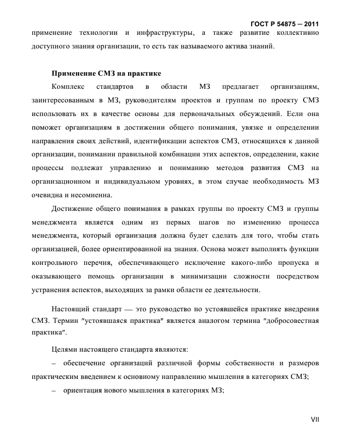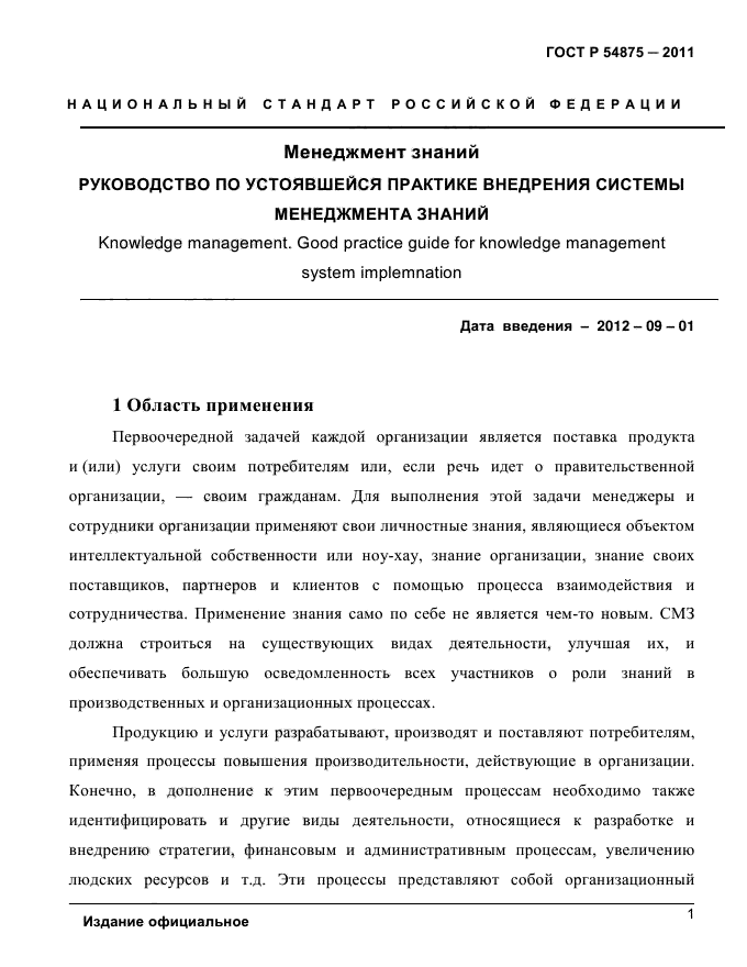 | Область и условия применения: | Первоочередной задачей каждой организации является поставка продукта и (или) услуги своим потребителям или, если речь идет о правительственной организации, - своим гражданам. Для выполнения этой задачи менеджеры и сотрудники организации применяют свои личностные знания, являющиеся объектом интеллектуальной собственности или ноухау, знание организации, знание своих поставщиков, партнеров и клиентов с помощью процесса взаимодействия и сотрудничества. Применение знания само по себе не является чемто новым. СМЗ должна строиться на существующих видах деятельности, улучшая их, и обеспечивать большую осведомленность всех участников о роли знаний в производственных и организационных процессах |