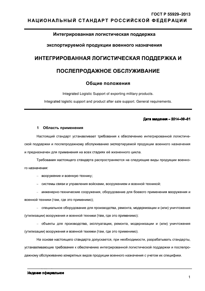Требования настоящего стандарта распространяются на следующие виды продукции военного назначения: - вооружение и военную технику; - системы связи и управления войсками, вооружением и военной техникой; - инженерно-технические сооружения, оборудование для боевого применения вооружения и военной техники (там, где это применимо); - специальное оборудование для производства, ремонта, модернизации и (или) уничтожения (утилизации) вооружения и военной техники (там, где это применимо); - объекты для производства, эксплуатации, ремонта, модернизации и (или) уничтожения (утилизации) вооружения и военной техники (там, где это применимо). На основе настоящего стандарта допускается, при необходимости, разрабатывать стандарты, устанавливающие требования к обеспечению интегрированной логистической поддержки и послепродажному обслуживанию конкретных видов продукции военного назначения с учетом их специфики |