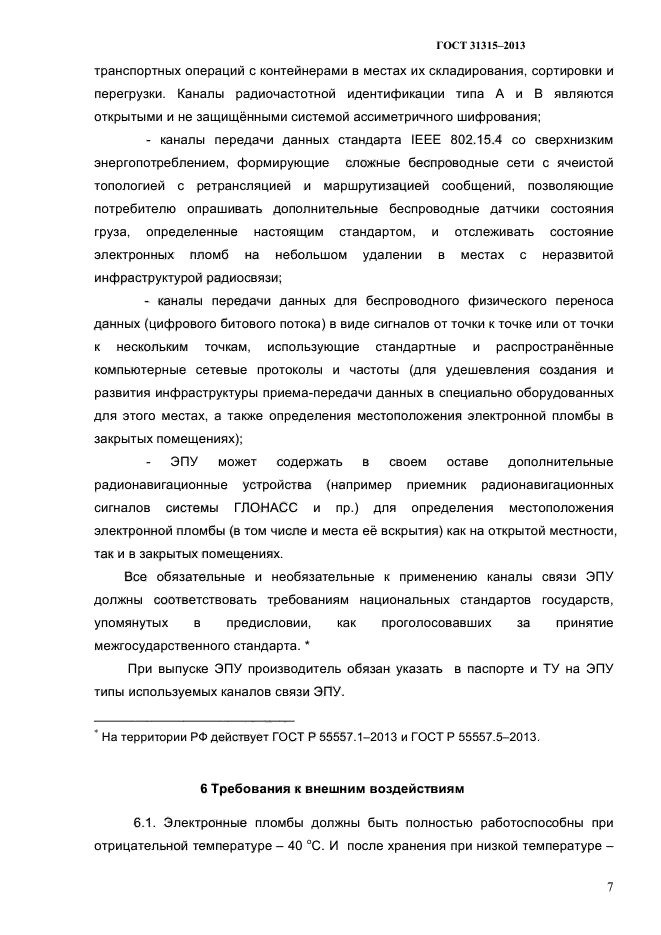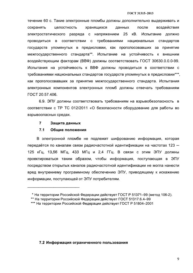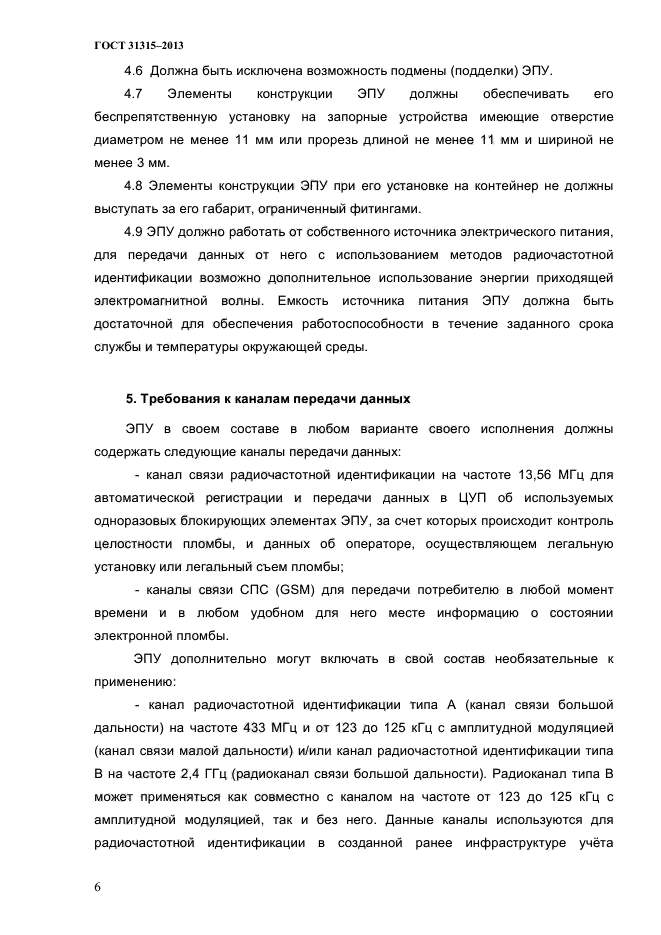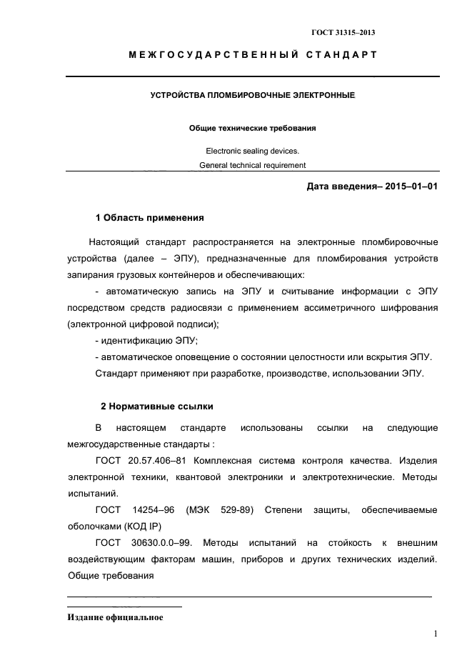 | Область и условия применения: | Настоящий стандарт распространяется на электронные пломбировочные устройства (далее - ЭПУ), предназначенные для пломбирования устройств запирания грузовых контейнеров и обеспечивающих: