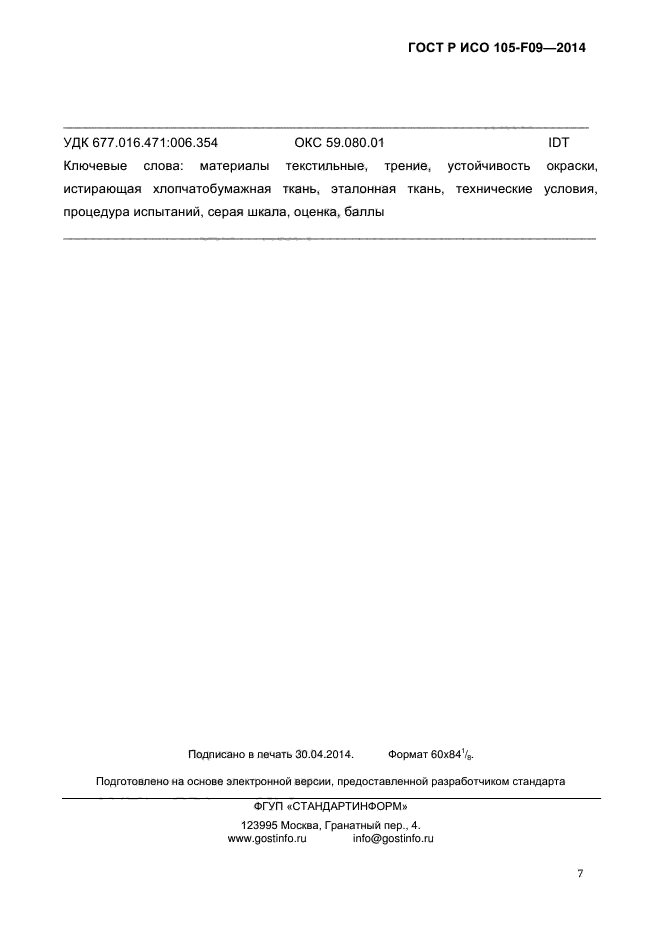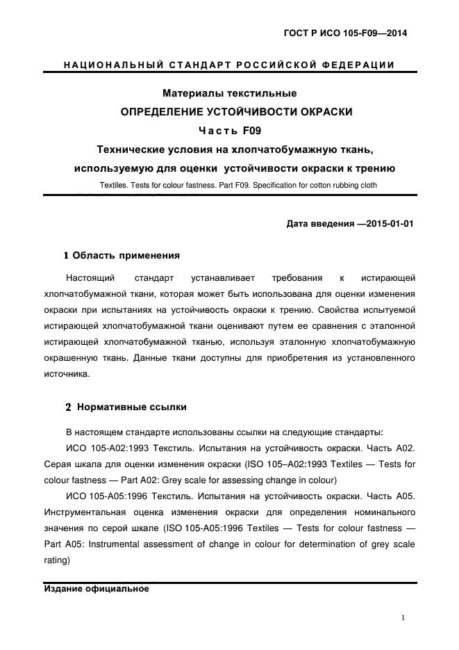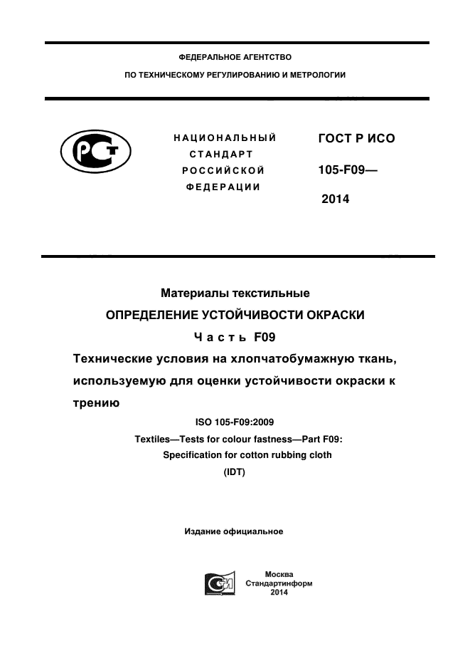 | Название рус.: | Материалы текстильные. Определение устойчивости окраски. Часть F09. Технические условия на хлопчатобумажную ткань, используемую для оценки устойчивости окраски к трению |