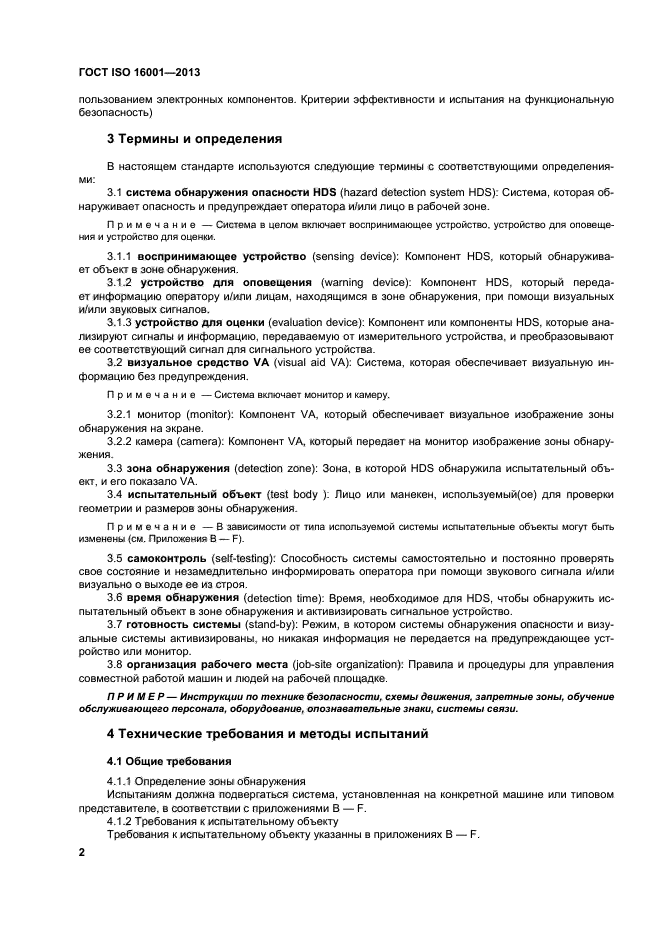 Настоящий стандарт включает следующие аспекты: - распознавание людей в зоне обнаружения; - визуальное и/или звуковое предупреждение(я) для оператора и/или лица в зоне обнаружения; - эксплуатационная надежность системы; - совместимость и экологические характеристики системы. Это применимо к машинам, которые обозначены в ISO 6165. HDS и/или VA могут быть использованы для увеличения зоны прямой видимости оператора (см. ISO 5006) или непрямой видимости при помощи зеркал (см. ISO 14401) или могут предоставлять дополнительные средства обнаружения опасности, например, когда эргономические факторы ограничивают эффективность прямой видимости, чтобы избежать повторного поворота головы или верхней части тела |
