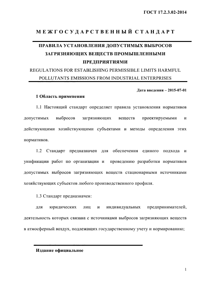 | Область и условия применения: | Настоящий стандарт определяет правила установления нормативов допустимых выбросов загрязняющих веществ проектируемыми и действующими хозяйствующими субъектами и методы определения этих нормативов.