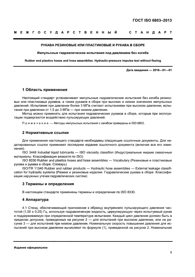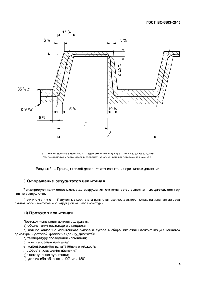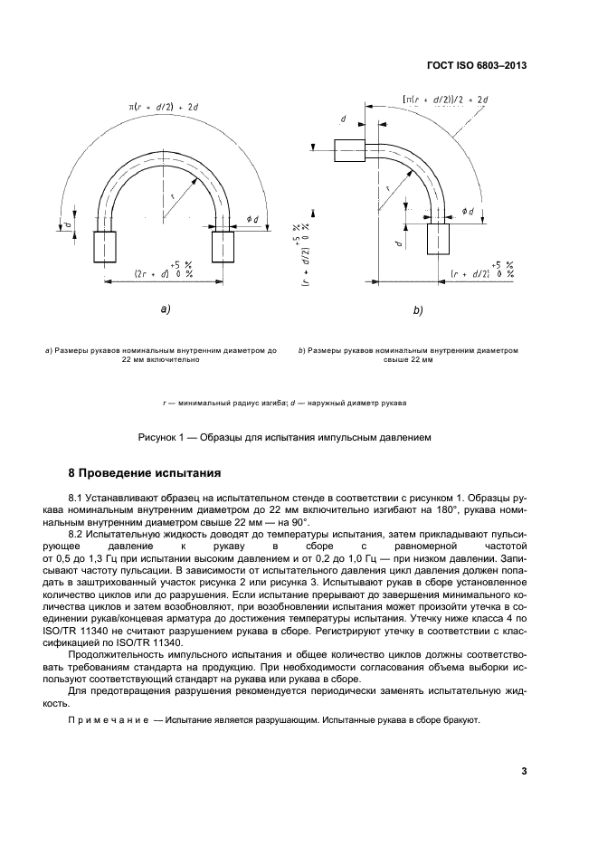 Настоящий стандарт устанавливает импульсные гидравлические испытания без изгиба резиновых или пластиковых рукавов, а также рукавов в сборе при высоких и низких значениях импульсных давлений. Испытания при давлении более 3 МПа считают испытаниями при высоком давлении, испытания при давлении от 1,5 до 3 МПа – при низком давлении