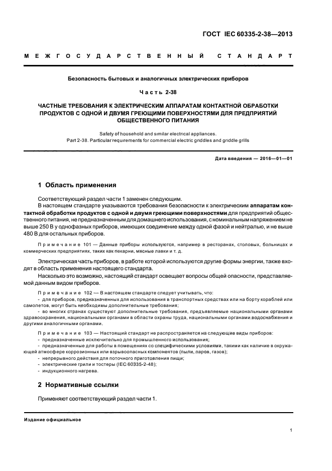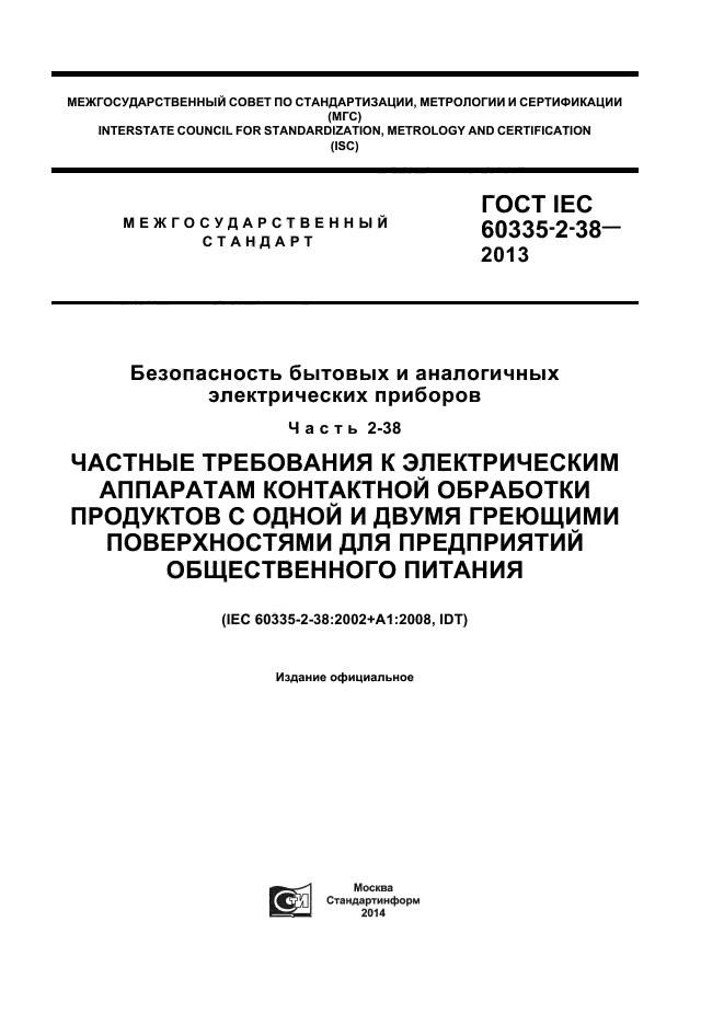 | Название рус.: | Безопасность бытовых и аналогичных электрических приборов. Часть 2-38. Частные требования к электрическим аппаратам контактной обработки продуктов с одной и двумя греющими поверхностями для предприятий общественного питания |