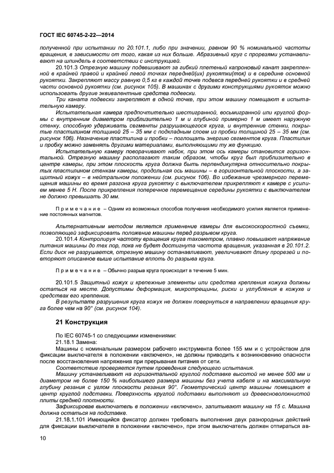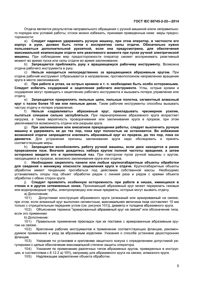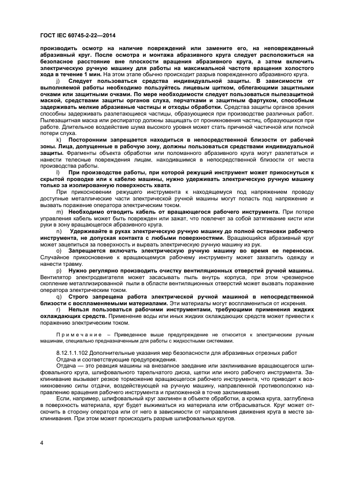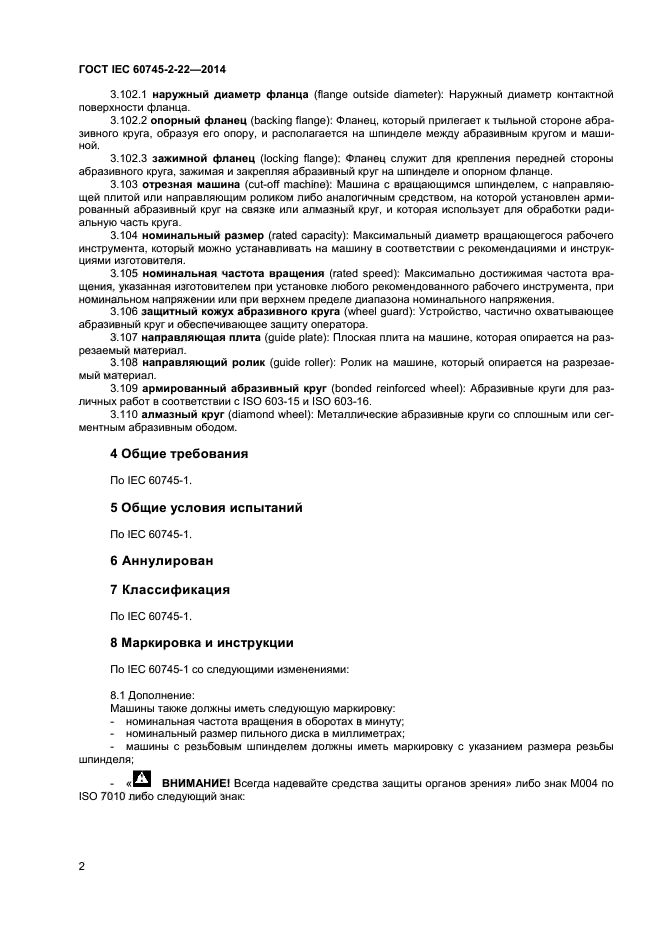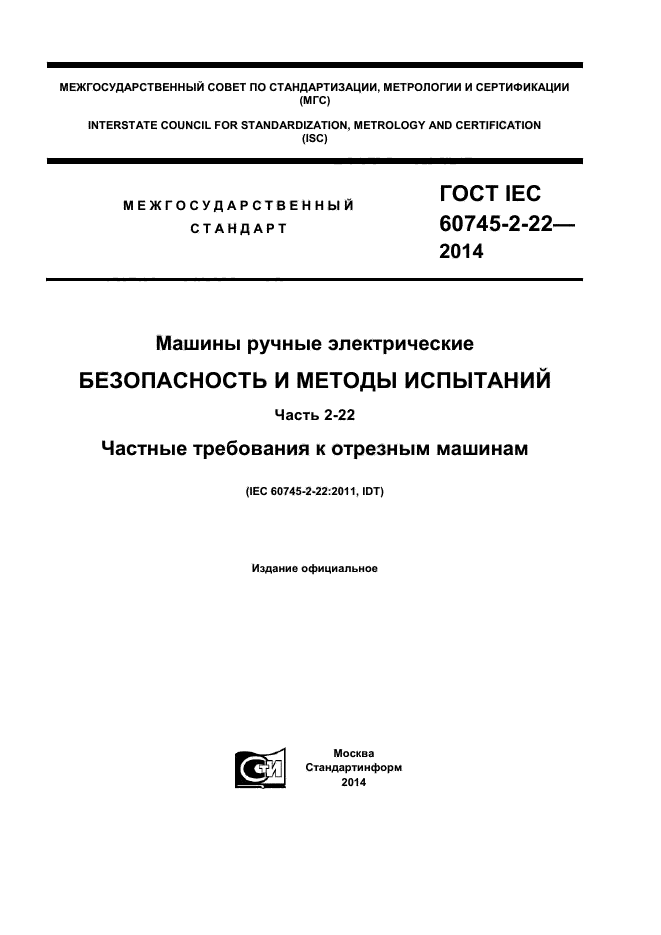| Название рус.: | Машины ручные электрические. Безопасность и методы испытаний. Часть 2-22. Частные требования к отрезным машинам |