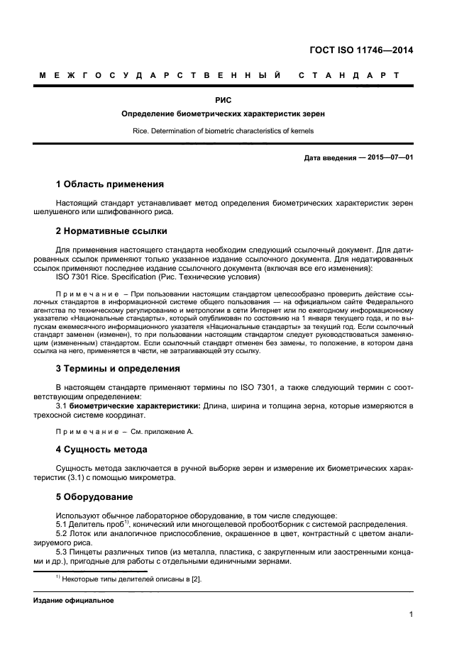 | Область и условия применения: | Настоящий стандарт устанавливает метод определения биометрических характеристик зерен шелушеного или шлифованного риса |