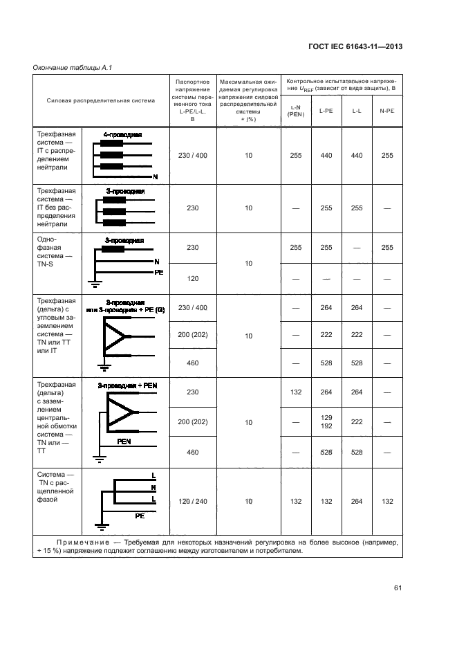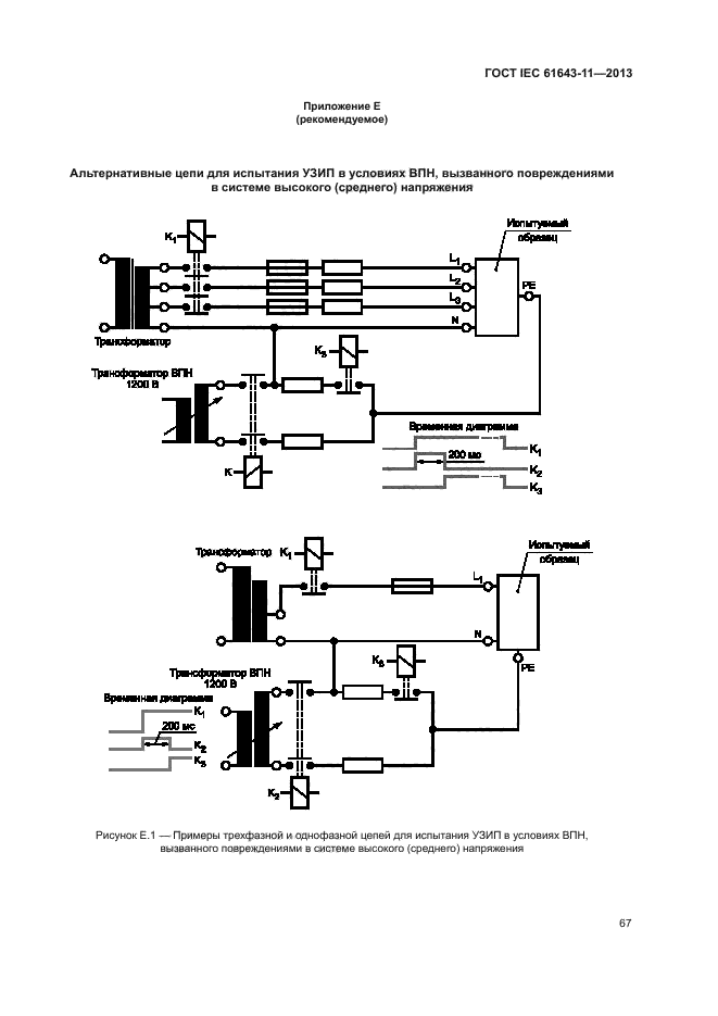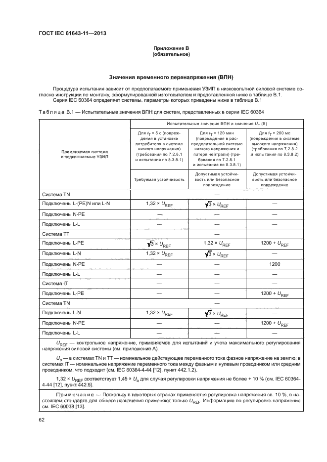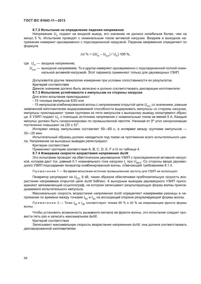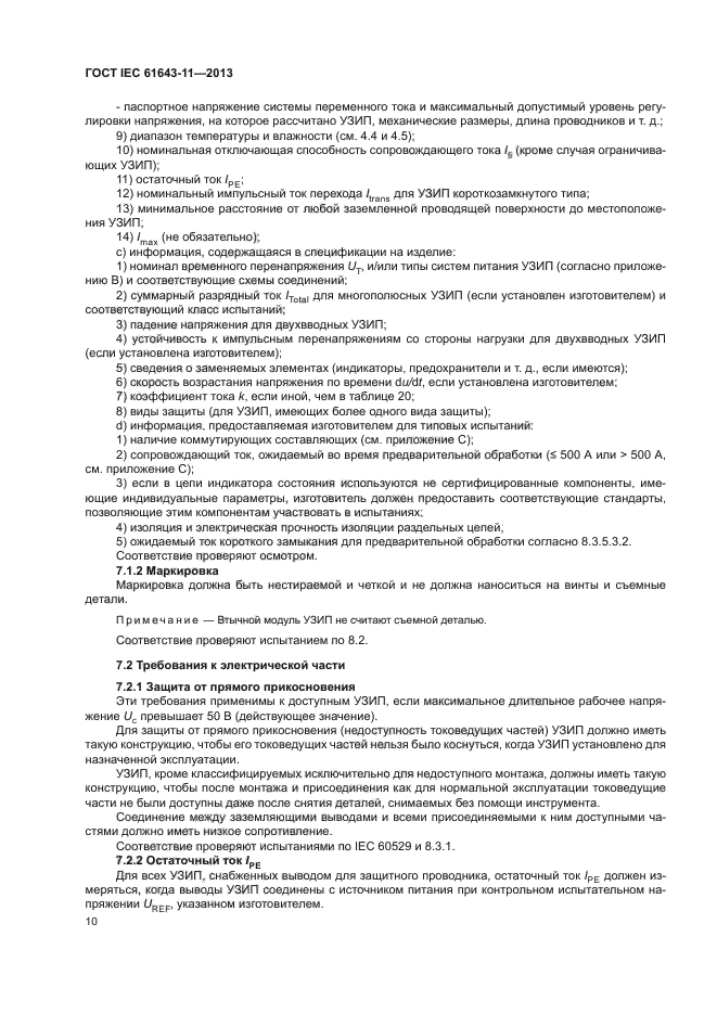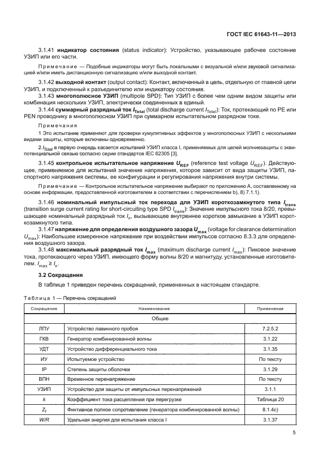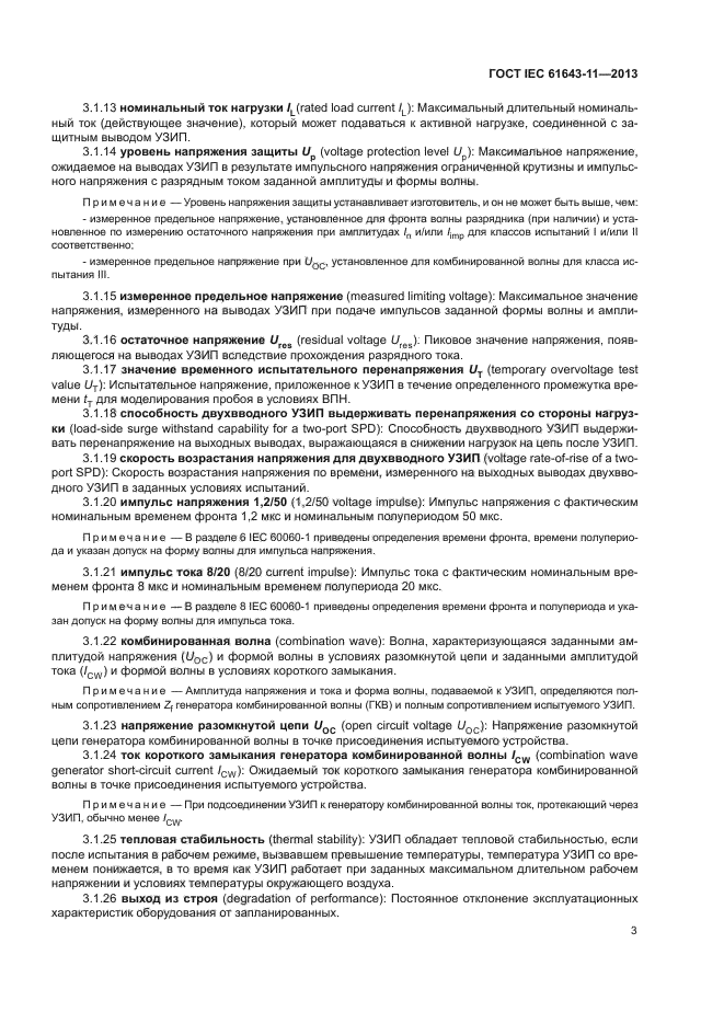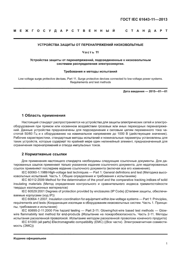 Настоящий стандарт распространяется на устройства для защиты электрических сетей и электрооборудования при прямом или косвенном воздействии грозовых или иных переходных перенапряжений. Данные устройства предназначены для подсоединения к силовым цепям переменного тока частотой 50/60 Гц и к оборудованию на номинальное напряжение до 1000 В (действующее значение). Рабочие характеристики, стандартные методы испытаний и номинальные параметры установлены для таких устройств, которые содержат, по крайней мере, один нелинейный элемент, предназначенный для ограничения перенапряжений и отвода импульсных токов