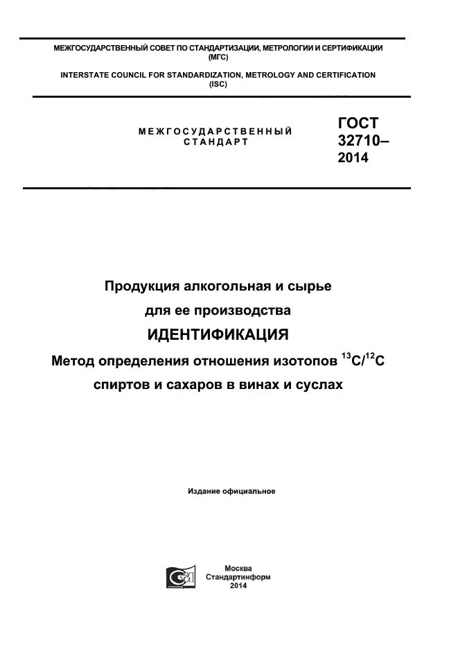 | Название рус.: | Продукция алкогольная и сырье для ее производства. Идентификация. Метод определения отношения изотопов 13С/12С спиртов и сахаров в винах и суслах |