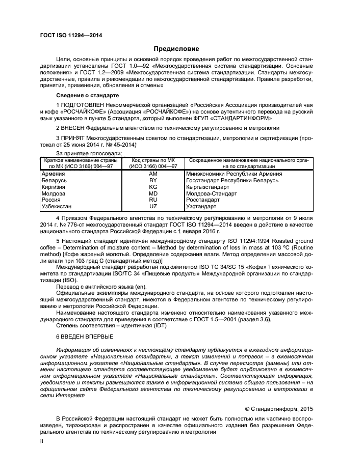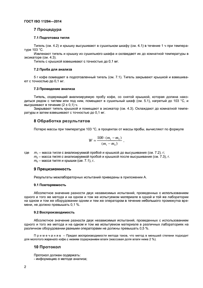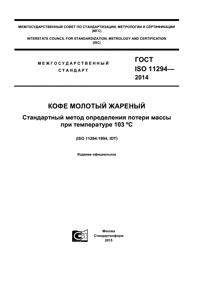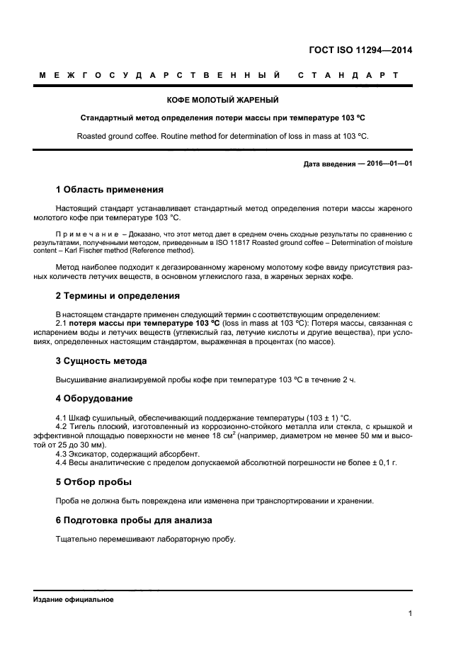 | Область и условия применения: | Настоящий стандарт устанавливает стандартный метод определения потери массы жареного молотого кофе при температуре 103 °С |