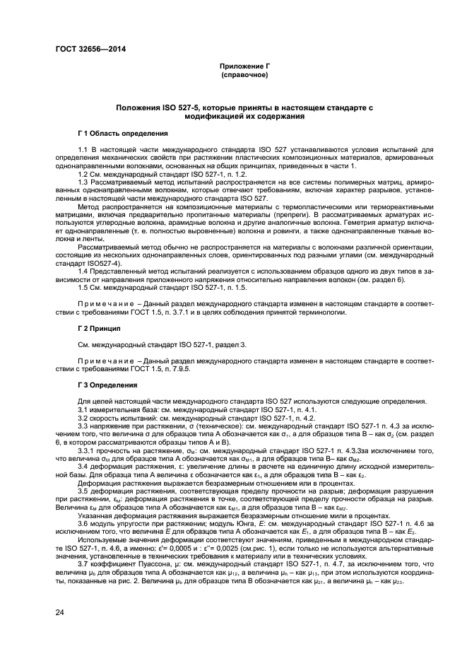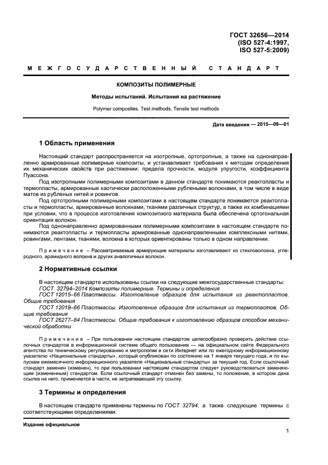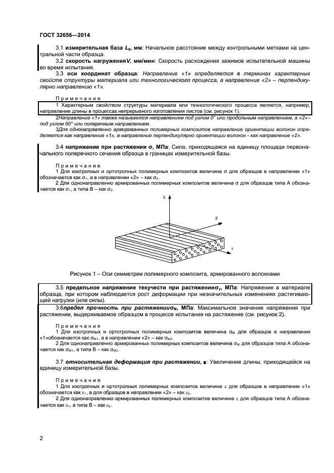 Под изотропными полимерными композитами в данном стандарте понимаются реактопласты и термопласты, армированные хаотически расположенными рублеными волокнами, в том числе в виде матов из рубленых нитей и ровингов. Под ортотропными полимерными композитами в настоящем стандарте понимаются реактопласты и термопласты, армированные волокнами, тканями различных структур, а также их комбинациями при условии, что в процессе изготовления композитного материала была обеспечена ортогональная ориентация волокон. Под однонаправленно армированными полимерными композитами в настоящем стандарте понимаются реактопласты и термопласты армированные однонаправленными комплексными нитями, ровингами, лентами, тканями, волокна в которых ориентированы только в одном направлении |
