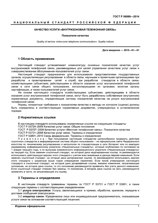 | Область и условия применения: | Настоящий стандарт устанавливает номенклатуру основных показателей качества услуг внутризоновой телефонной связи, рекомендуемых для целей управления качеством услуг связи и совершенствования обслуживания пользователей услуг связи.