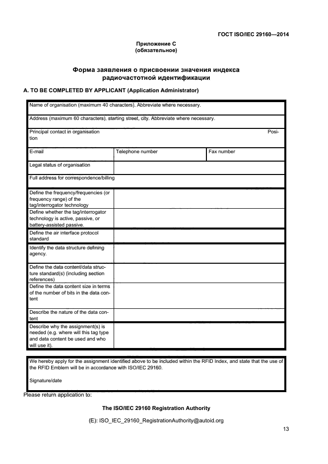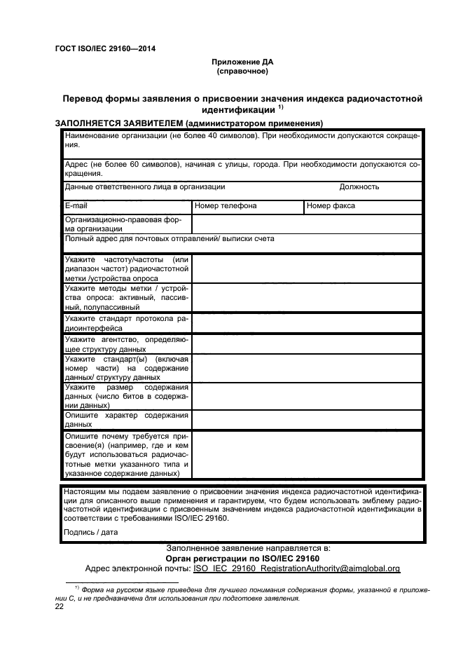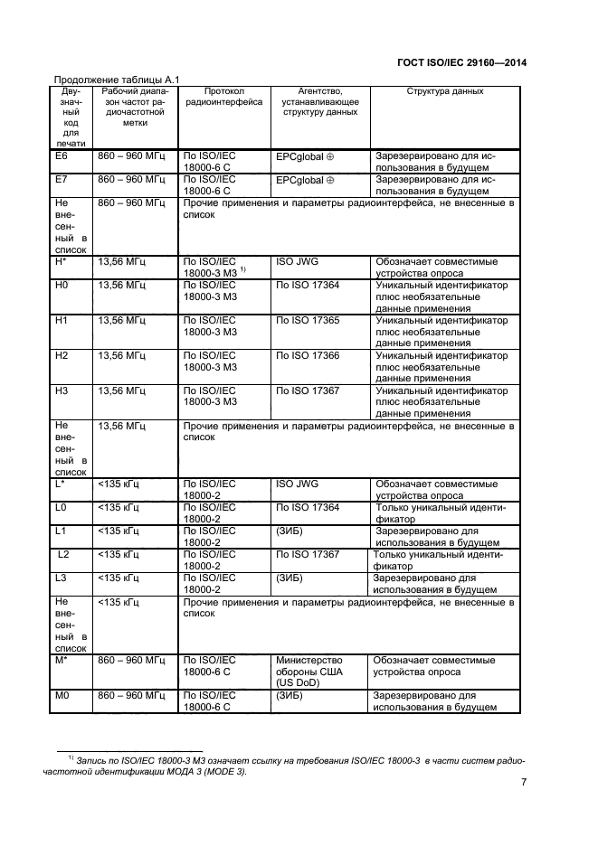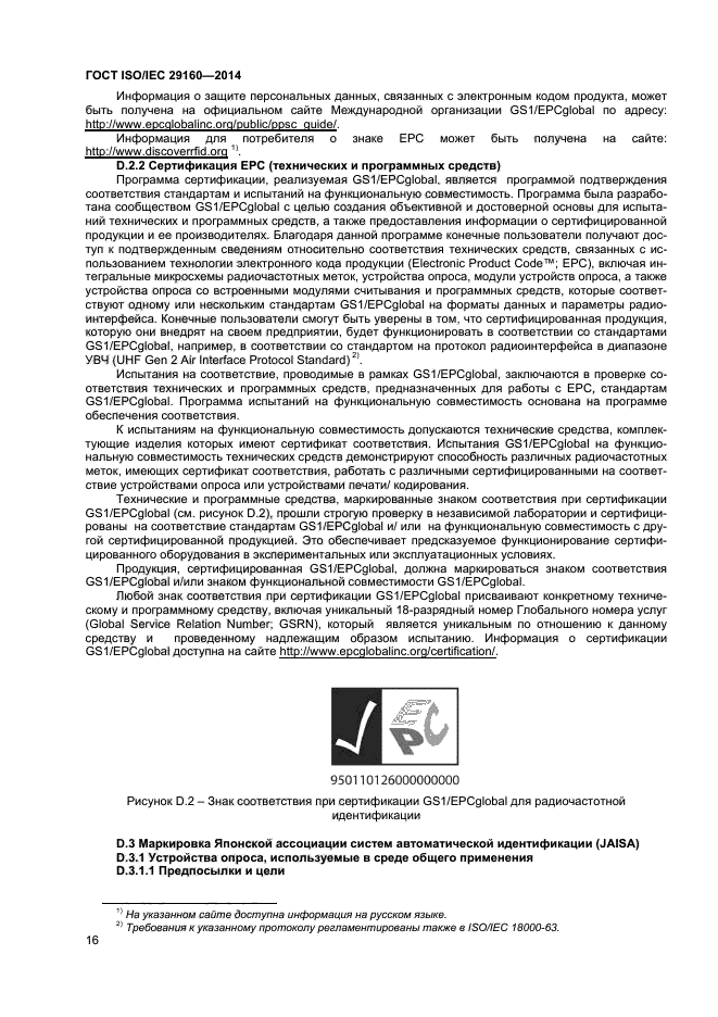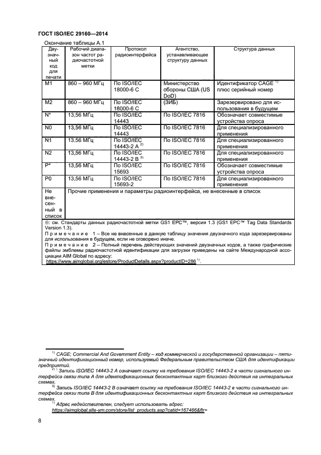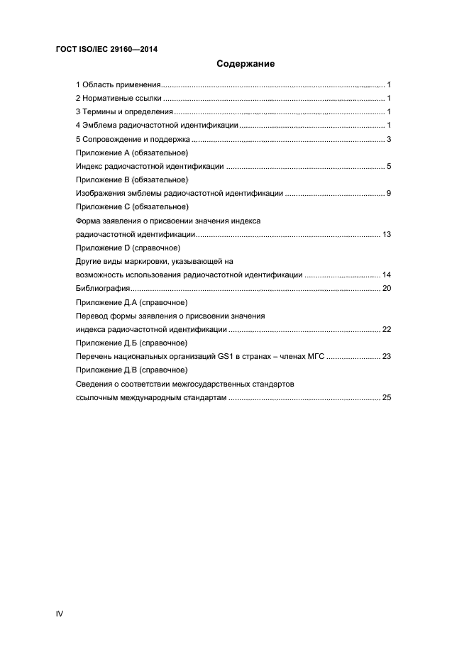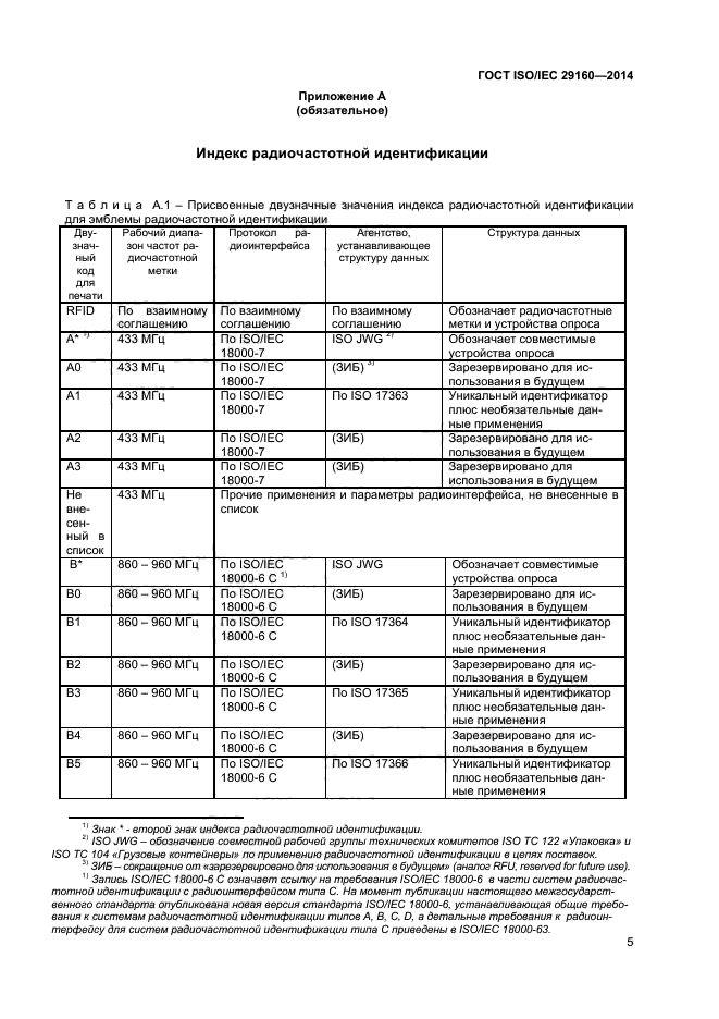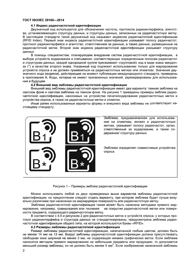 Настоящий стандарт устанавливает также требования к индексу радиочастотной идентификации (RFID index), который может быть включен в эмблему радиочастотной идентификации и который учитывает затруднения согласования системы радиочастотной идентификации, связанные с широким ассортиментом радиочастотных меток (разные частоты, протоколы передачи данных, структуры данных). Индекс радиочастотной идентификации - это двузначный код, в котором содержатся специфические сведения о совместимых радиочастотных метках и устройствах считывания/ опроса. Для обеспечения считывания радиочастотной метки необходимы сведения о ее рабочей частоте, протоколе передачи данных и структуре данных, представляемые в индексе радиочастотной идентификации