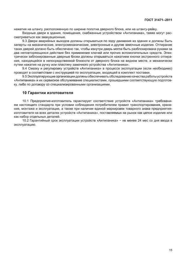 | Область и условия применения: | Настоящий стандарт распространяется на устройства экстренного открывания дверей эвакуационных и аварийных выходов (далее – устройства «Антипаника») общественных, производственных и жилых зданий и сооружений различного назначения с массовым пребыванием людей (торговые центры, больницы, школьные и дошкольные учреждения, залы ожидания и обслуживания вокзалов и аэропортов, киноконцертные залы, спортивно-зрелищные и т. п. сооружения) в случае возникновения пожара или другой чрезвычайной ситуации для обеспечения безопасности и эффективной эвакуации людей, материальных ценностей, а также снижения вероятности воздействия на людей опасных факторов пожара или другой чрезвычайной ситуации.