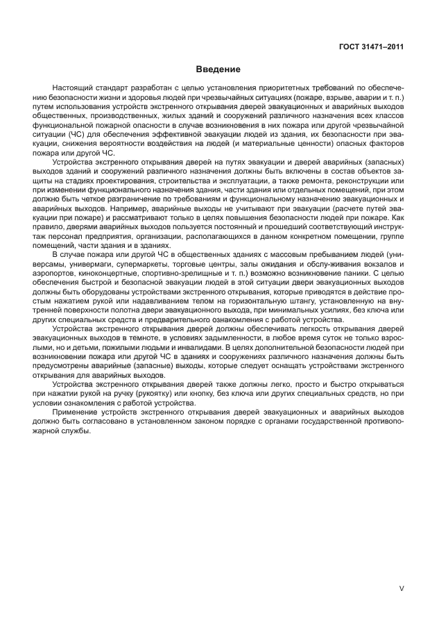Настоящий стандарт распространяется на устройства экстренного открывания дверей эвакуационных и аварийных выходов (далее – устройства «Антипаника») общественных, производственных и жилых зданий и сооружений различного назначения с массовым пребыванием людей (торговые центры, больницы, школьные и дошкольные учреждения, залы ожидания и обслуживания вокзалов и аэропортов, киноконцертные залы, спортивно-зрелищные и т. п. сооружения) в случае возникновения пожара или другой чрезвычайной ситуации для обеспечения безопасности и эффективной эвакуации людей, материальных ценностей, а также снижения вероятности воздействия на людей опасных факторов пожара или другой чрезвычайной ситуации.