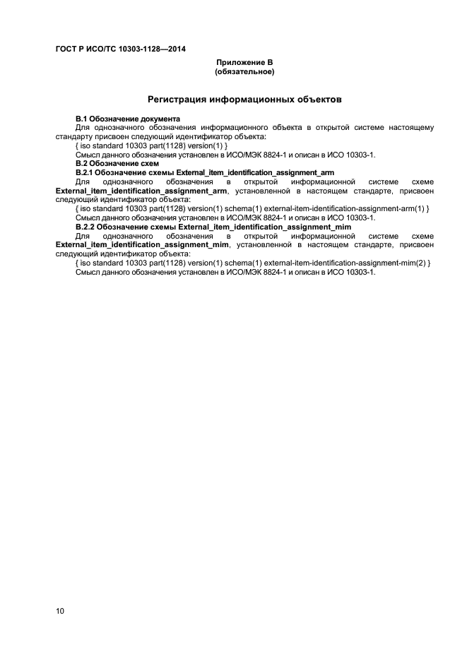 | Название рус.: | Системы автоматизации производства и их интеграция. Представление данных об изделии и обмен этими данными. Часть 1128. Прикладной модуль. Задание обозначения внешнего документа |