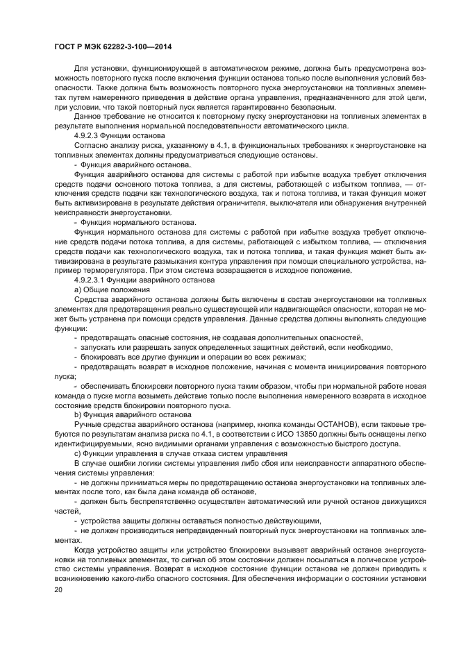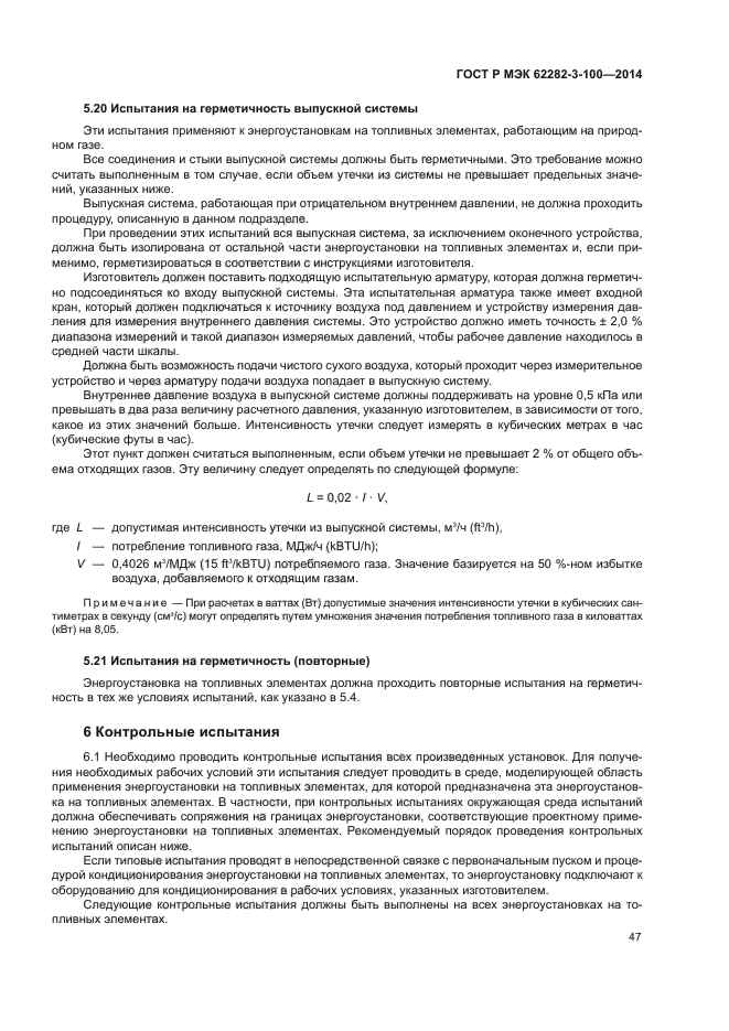 Стандарт распространяется на энергоустановки, предназначенные: - для подключения к сети электроснабжения напрямую, либо при помощи переключателя ввода резерва, или к автономной системе распределения энергии; - снабжения энергией переменного или постоянного тока; - рекуперации полезного тепла или без рекуперации; - работы на следующих видах топлива, подаваемых на вход: a) природный газ и другие газы с высоким содержанием метана, полученные из возобновляемых источников энергии (биомасса) или ископаемого топлива, такие как газ из органических отходов, газ ферментативного разложения, шахтный газ; b) топливо, получаемое при переработке нефти, например, дизельное топливо, бензин, керосин, сжиженные нефтяные газы, такие как пропан и бутан; c) спирты, сложные эфиры, альдегиды, кетоны, жидкости Фишера-Тропша и другие органические соединения с высоким содержанием водорода, получаемые из возобновляемого топлива (биомасса) или ископаемого топлива; d) водород, газообразные смеси, содержащие водород, например, синтез-газ, коммунальный газ. Настоящий стандарт не распространяется на следующие энергоустановки: - микро-энергоустановки на топливных элементах; - переносные энергоустановки на топливных элементах; - силовые энергоустановки на топливных элементах. Настоящий стандарт распространяется на стационарные энергоустановки на топливных элементах, предназначенные для коммерческого, промышленного и бытового использования внутри и снаружи помещений, расположенных в пожаро- и взрыво-безопасных зонах |