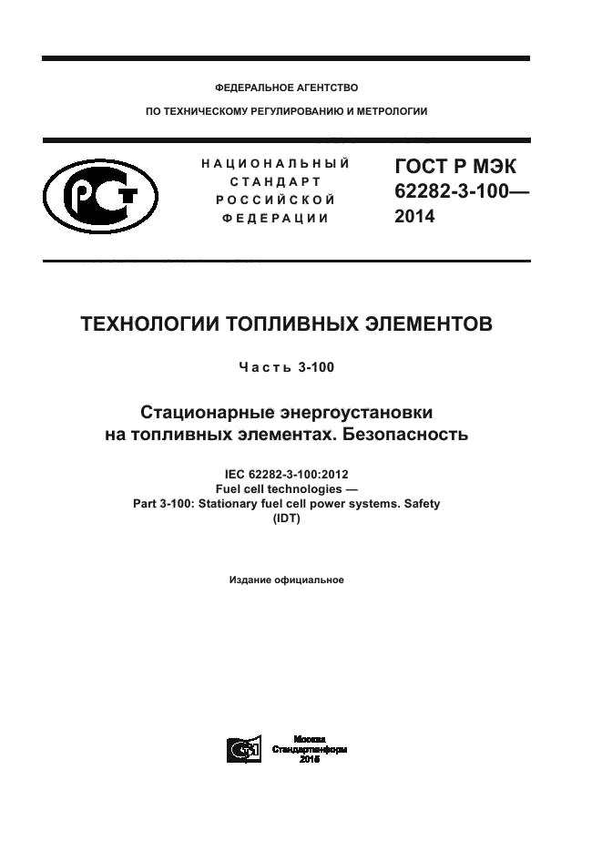| Название рус.: | Технологии топливных элементов. Часть 3-100. Стационарные энергоустановки на топливных элементах. Безопасность |