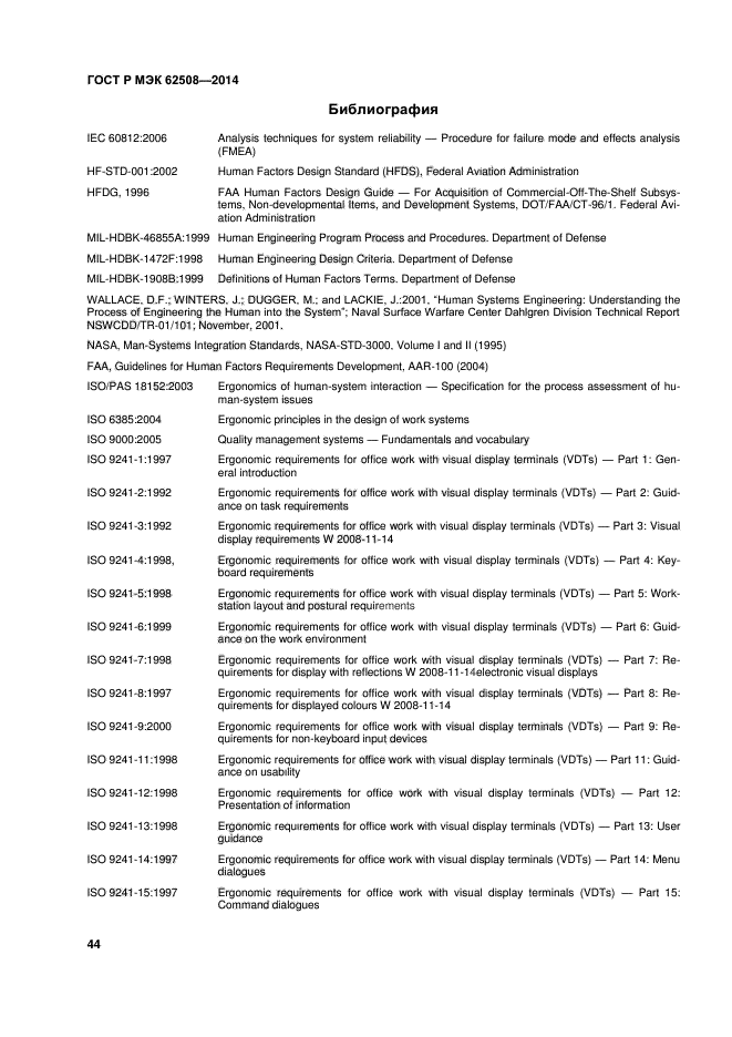 | Область и условия применения: | В настоящем стандарте установлено руководство по обеспечению надежности, связанной с человеческим фактором, и ориентированное на методы человеко-ориентированного проектирования и повышения надежности, которые могут быть использованы на всех этапах жизненного цикла системы. В стандарте описаны качественные методы. Примеры количественных методов приведены в приложении A.